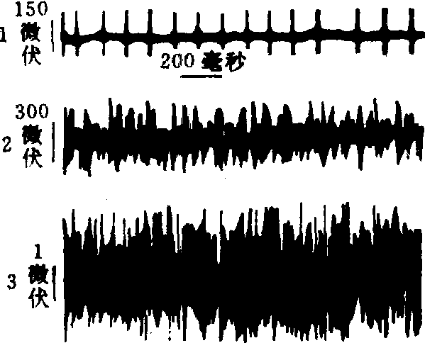 1.单纯相;2.混合相;3.干扰相图1.14-1 正常肌肉不同程度用力收缩的肌电图 |