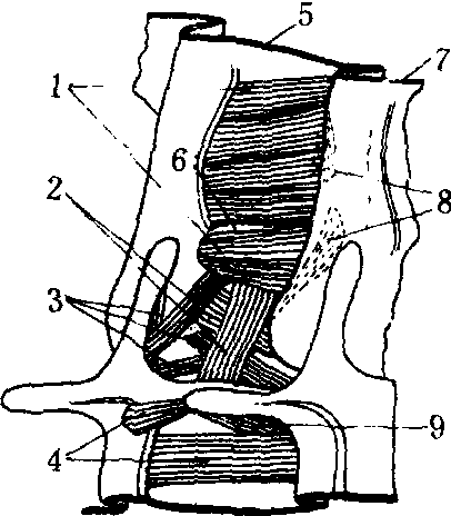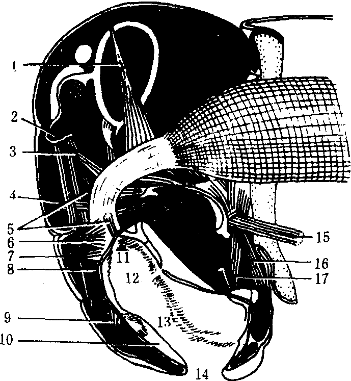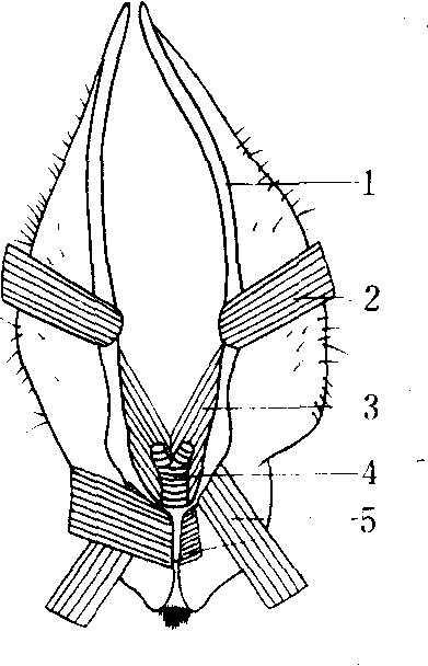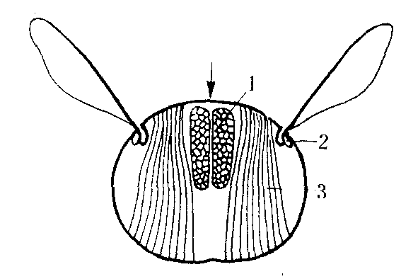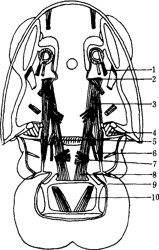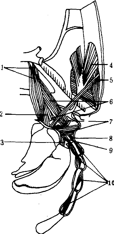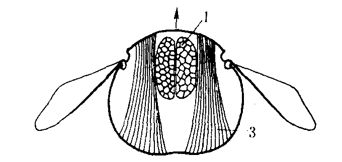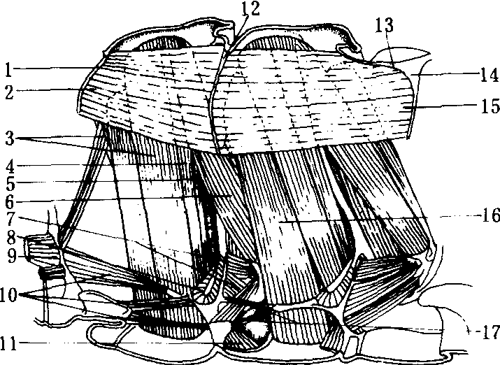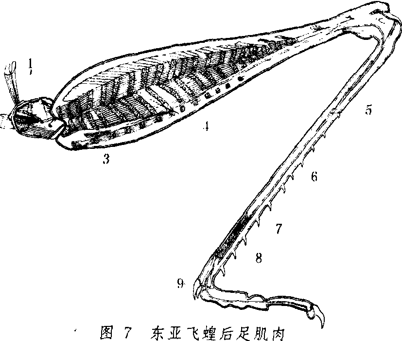 颈部肌肉 见颈膜。 胸部肌肉 主要包括背纵肌、背腹肌.侧肌、腹纵肌及足肌五大类。背纵肌(图5)是纵贯于背面的肌肉,着生于节间褶或翅胸的悬骨上,成为翅的主要降肌。中胸、后胸的背纵肌分别位于第一、二及第二、三悬骨间。在无翅及飞翔力弱的昆虫中,这些肌肉不发达或退化。前胸背纵肌起源于第一悬骨,着生于次后头,是一对活动头部的重要纵肌。背腹肌是连接于背面与腹面间的肌肉,在翅胸中为翅的主要提肌,在背面着生于盾片的两侧,腹面着生于基腹片上。侧肌包括起源于足基节前、后的腹板或侧腹片以及足的基节腱或基内脊,着生于前上侧片的前、后翅第一、二前旋——伸肌;起源于足基节基内脊,背面着生于后上侧片的前后翅降伸肌; 以及源于侧内脊,着生于翅基部靠近第三腋片的膜上,能使翅折叠的翅屆肌。三组肌肉为运动翅的主要肌肉,背纵肌收缩使背板向背面弧拱,致使翅向下;背腹肌收缩引起胸腔扁收,致使翅向上。两组肌内轮流收缩,翅作上、下拍动,它们是间接翅肌(图6)。侧肌的6对肌肉着生在翅基部的上侧片或者近翅腋片处,收缩时牵动腋片,导致翅的伸张、旋动及折屈,称直接翅肌。腹纵肌包括伸展在腹内突之间、内刺突之间及内刺突与腹内突间的肌肉(图5)。前胸的腹纵肌起源于腹内突,着生在幕骨桥后臂,司头下部作偏向活动。足肌是运动足的肌肉,包括外来肌和内在肌两类。外来肌司足的整体运动,起源于背板,包括着生在基外片和基节基缘的基节前动肌和后动肌(图7),司足作前、后及里、外的水平向运动; 起源于腹内突上,着生在基节基缘的基节展肌和收肌,使足作上、下并略带前、后或里、外的运动;起源于腹内突、内刺突或腹板内脊上。着生在基节基缘的基节前旋肌和后旋肌,使足向前外方及后外方旋动; 以及一组起源于背板、腹内突及基节,着生在转节基缘的转节降肌,因为腿节和转节间的关节固定,这组肌肉收缩,使足下降。内在肌包括起源于基节基部或中部,着生在转节背缘的转节背、腹(或前、后)提肌,使腿作上举运动; 起源于转节腹面,着生在腿节基部背面的腿节提肌,但蝗虫无此提肌,而在前、中足具有腿节后移肌; 起源于腿节或转节,着生在胫节背端的胫节前、后提肌和降肌,提肌使胫节上提,降肌使足作屈折活动。蝗虫后足此提肌十分发达,由很多“人”字形的羽状纤维组成,猛烈收缩时使胫节上提,在跳跃时起着主要作用; 起源于胫节的端半部,分别着生于跗节基部背缘和腹缘的跗节提肌和降肌,使跗节作向上或向下的活动; 起源于腿节和胫节,着生在掣爪片上并贯穿腿节、胫节和跗节的细腱上的爪是缩肌,收缩时拉动掣爪片,使爪向下(图7)。
