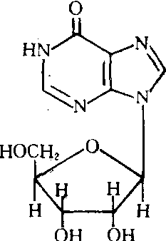 又称次黄苷。次黄嘌呤与核糖组成的核苷。结构式如右。某些tRNA中的一种修饰核苷。肌苷酸部分水解的产物。可以直接进入细胞,参与糖代谢、能量代谢及蛋白质合成,具有活化肝功能、促进受损肝脏恢复、刺激体内产生抗体等作用。常用于治疗急慢性肝炎、心肌梗塞、白细胞减少等多种疾病。