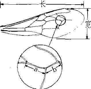 工蜂前翅第二中脉向上的分支(反曲翅脉),将第三脉室分为长短不等的a、b两部分的比值。通常用a/b(或用b/a的百分数)表示。是蜂种鉴定的一个重要指标。在蜂种鉴定时,工蜂和雄蜂都要测定这一数值。