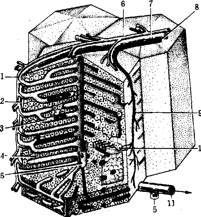 图 1 三种肝单位示意图 经典肝小叶 即一般所称的肝小叶,为多面形的棱柱体,横切面呈多角形,周围有少量结缔组织分隔,血管、淋巴管和胆管分支穿行其中。小叶中央贯穿中央静脉,肝细胞单行排列成肝板分布于中央静脉四周。肝细胞较大,呈多角形,有1~2个大而圆的核,胞质内有丰富的细胞器和包含物。肝板有分支,互相吻合成网,板上还有彼此沟通的孔道,网孔内有窦状毛细血管,称肝血窦(图2)。窦壁有两种细胞,主要是有窗孔的内皮细胞。细胞间有较大间隙,多数哺乳动物内皮细胞外无基膜,只附有少量散在的网状纤维,故通透性较大,有利于血液与肝细胞间进行物质交换; 另一种是巨噬细胞或称枯否氏细胞。体积较大,形状多样,有多个突起,故又称星状细胞。其胞体突入腔内或游离于腔中,以突起附着于内皮细胞上。巨噬细胞对血液中的异物和胃肠来的细菌等有很强的吞噬能力,故有杀菌防病作用。肝细胞与内皮细胞之间有狭小间隙,称窦周间隙或狄斯氏间隙,是肝细胞与血液间进行物质交换的场所。间隙内充满了从肝血窦渗透出来的血浆,一般无红细胞,还有少量散在的网状纤维和贮脂细胞。后者为形状不规则的细胞,具有贮存脂肪和维生素A以及生成结缔组织纤维和基质等作用。肝细胞向窦周间隙的一面伸出许多微绒毛,有扩大肝细胞表面积的作用。