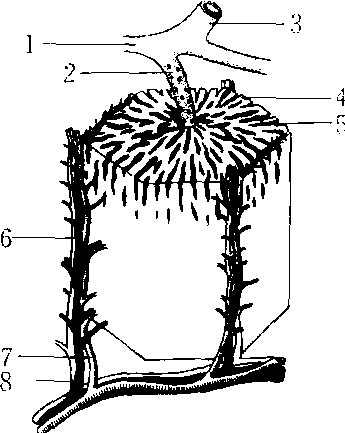 肝小叶 1. 小叶下静脉 2. 中央静脉 3. 肝静脉 4. 肝板 5. 肝血窦 6. 小叶间胆管7. 小叶间动脉 8. 小叶间静脉 |