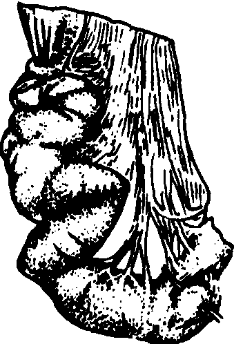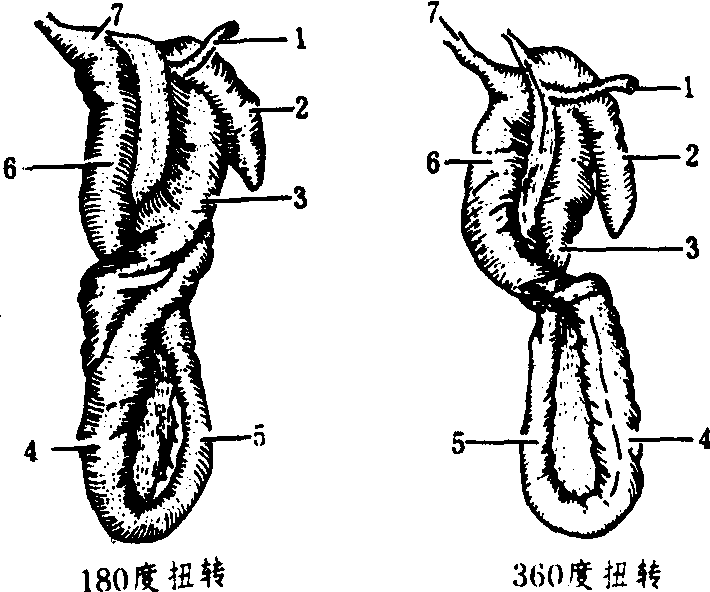 图3 马肠套叠 证见病初间歇性腹痛起卧;继则腹痛加剧而变为持续性,前蹄刨地,后肢踢腹,急起急卧,左右滚转;或仰卧朝天,抱胸咬臆。甚至全身出汗,肌肉颤抖,肚腹胀大,呼吸迫促,耳、鼻、四肢发凉,体温升高;排粪停止,肠音消失,心音亢进。口色青紫,口腔干燥;脉象细数。全身症状很快恶化,使用一般镇痛药无效。如为小肠绞痛,易继发大肚结,兼见鼻流粪水,导胃可排出大量黄褐色酸臭液体;大肠绞痛,则易继发气胀,放气后不久腹部又逐渐胀大。腹腔穿刺时, 多流出混浊或暗红液体。直肠入手检查, 肠系膜紧张或扭转, 某段肠管位置和状态异常,并有局限性臌气,触及患部疼痛不安。如左大结肠扭转, 在腹腔左侧可摸到中间小两头大呈螺旋状的粗大而有弹性的臌气肠管;左大结肠折叠, 如折叠处靠后,可摸到骨盆曲向前折转,折叠处靠前则摸不着; 盲肠扭转, 可在腹腔偏右侧摸到向前下方伸延的粗大肠管的位置改变而纵带呈螺旋状;小肠缠结, 可摸到前肠系膜紧张或根部呈螺旋索状,小肠和肠系膜绞缠在一起;小肠套叠,可摸到小臂粗香肠状肉样而有弹性的肠管;肠钳闭, 可摸到小肠或小结肠落入腹股沟管(见肠入阴)等孔隙内,肠段呈索状,不易牵动。各种小肠绞痛, 因继发大肚结,还可摸到胃臌胀积液。如临证不能确诊,则应及时剖腹探查。 治宜手术整复,不可妄下。继发大肚结和气胀的,宜先导胃和穿刺放气。如左大结肠轻度扭转, 可试行直肠入手整复,摸清扭转方向, 向相反的方向拨动;左大结肠向前折叠,则向后拨动。扭转严重及肠缠结、肠套叠、肠钳闭, 均应及早进行剖腹手术整复。如肠管已坏死, 则作肠管切除及吻合术, 并尽量排空病变前段的内容物;如有结粪, 应将结粪压开, 并结合强心、补液、清热解毒等疗法。术后加强护理, 少让病畜卧地, 畜圈铺以干净褥草, 防止术部感染,喂给稀粥、青干草等容易消化的饲料。 |