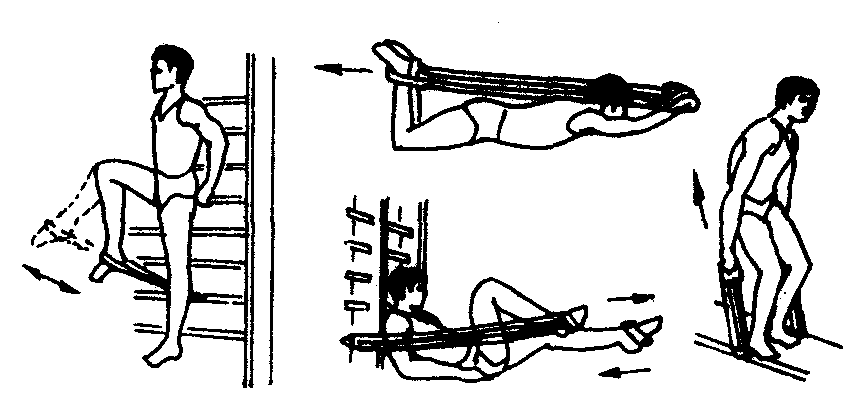 ❸腿蹬出:仰卧,将弹性物体固定在全屈的两腿踝关节处,然后交替向前蹬出,像踏自行车。