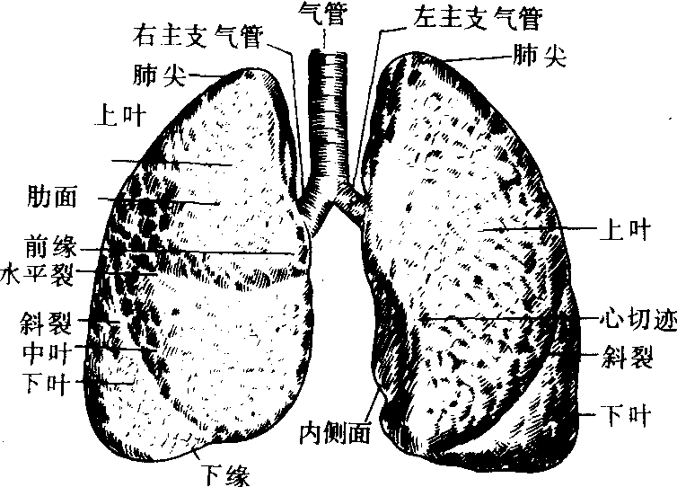 | 释义 | 肺fei呼吸器官。位于胸腔内,左右各一。柔软而有弹性,颜色随年龄和职业而不同。新生儿的肺淡红色,成人的肺呈暗灰色,并混有黑色斑点。两肺均呈圆锥形,肺尖向上,稍圆钝,肺底在下面,并向上凹入,与膈相接触。左肺分上、下两叶,右肺分上、中、下3叶。纵隔面中央有肺门,是支气管、肺血管、神经及淋巴管出入肺之处。肺由浆膜和肺实质两部分构成。浆膜被覆于肺表面,肺实质由导管部 (支气管树)、呼吸部(主要为肺泡)和肺间质(肺小叶间和肺泡间的结缔组织) 组成。肺的导管部即肺内各级支气管。左、右支气管分别分为肺叶支气管,进入肺叶。每个肺叶支气管再反复分支,最后成为细支气管。每一细支气管及其分布的肺组织形成一个肺小叶,肺小叶是肺的结构单位。在肺内支气管分支次数越多,管腔越细,管壁越薄,粘膜上皮也逐渐变薄,纤毛和腺体逐渐减少并消失; 外膜的软骨环逐渐变为片,至细支气管处完全消失。受迷走神经和交感神经双重支配的平滑肌相对增多。肺的呼吸部包括呼吸性细支气管、肺泡管、肺泡囊和肺泡,是进行气体交换的部位。呼吸性细支气管兼有呼吸道和气体交换的功能,肺泡是气体交换的主要场所。 肺lung五脏之一。位于胸中,上连气道。因肺叶娇嫩,不耐寒热,易被邪侵,故称其为“娇脏”。其经脉络大肠,与大肠相表里。 肺lung陆生脊椎动物进行气体交换的呼吸器官。肺与肺鱼和总鳍鱼类的鳔同源,发生于咽后方腹侧壁,随动物从水生过渡到陆生逐渐演变而成。肺鱼的鳔有呼吸功能; 两栖类的肺呈囊状,陆栖为主的囊内壁形成复杂的皱褶;爬行类的肺转变为海绵状;鸟类和哺乳类的肺最发达。