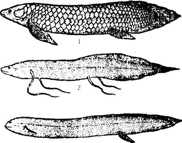 | 释义 | 肺鱼类Dipnoi和真口鱼类(Teleostomi)。海洋和淡水水域中均有分布。从鱼类开始,有了能活动的上颌和下颌,这在脊椎动物进化史上是个重大转折点,通过颌上的牙齿,不仅可以主动追捕、咬牢、撕割、研磨食物,而且也是进攻和防御的“武器”。此外,上、下颌还是营巢、钻洞、求偶、育幼等多种活动的工具。由于上、下颌的出现,引起动物体制结构的全面发展和提高。从鱼类开始,有了成对的附肢(胸鳍和腹鳍),不仅能维持身体平衡、改变运动的方向和加强游泳能力,而且还为陆生脊椎动物四肢的出现提供了先决条件。从鱼类开始,脊柱完全代替了脊索,虽然雏形的脊椎骨从圆口纲开始就有了,但演变成支持身体和保护脊髓的结构,还是从鱼类才开始有的。从鱼类开始,脑已明显分为5部分,并有1对鼻孔和内耳。脑和感官的发达,进一步促进了体内其他各部的协调和对外界环境的适应能力。限于水生环境,鱼类的进化和体制结构,在脊椎动物中还是处于低级水平。在分类学上,过去一直将鱼纲分为软骨鱼亚纲和硬骨鱼亚纲,由于这两个类群,早在泥盆纪有化石记录开始,就是两个独立发展的支系。因此,目前国内外鱼类学的专著上,有人将两个亚纲,上升为两个独立的纲,即软骨鱼纲和硬骨鱼纲,废弃了“鱼纲”这一阶元的名称。 肺鱼类feiyulei脊椎动物,鱼纲。是现在生存硬骨鱼中最古老、形态最特殊的1支淡水鱼类。种类极少,仅有3属5种。平时用鳃呼吸,当水域干涸时可用鳔直接呼吸空气,故称肺鱼。这类鱼具有内鼻孔和泄殖腔。如产于澳大利亚各河流中的澳洲肺鱼(Neocer-atodus forsteri),体侧扁,长达1米余;鳞大,胸鳍和腹鳍呈桡状,鳔1个,能在缺氧的水中用鳔直接呼吸空气。又如产于南美洲各河流中的美洲肺鱼=Lepidosirenparadoxa,体呈鳗形,偶鳍退化呈鞭状,鳔2个,旱季可钻入淤泥中进行夏眠,鳞微小。产于非洲河流中的非洲肺鱼(Protopterus annecteus),体细长,鳞小,胸鳍和腹鳍退化成带状,鳔2个,河水干涸时,能较长时间蛰伏于淤泥底,用鳔呼吸,或用身上的粘液粘起泥土,形成特殊的“鱼茧”,进入休眠状态,借鱼茧顶端的小孔和外界相通,完全依靠鳔呼吸,可长达数月之久。