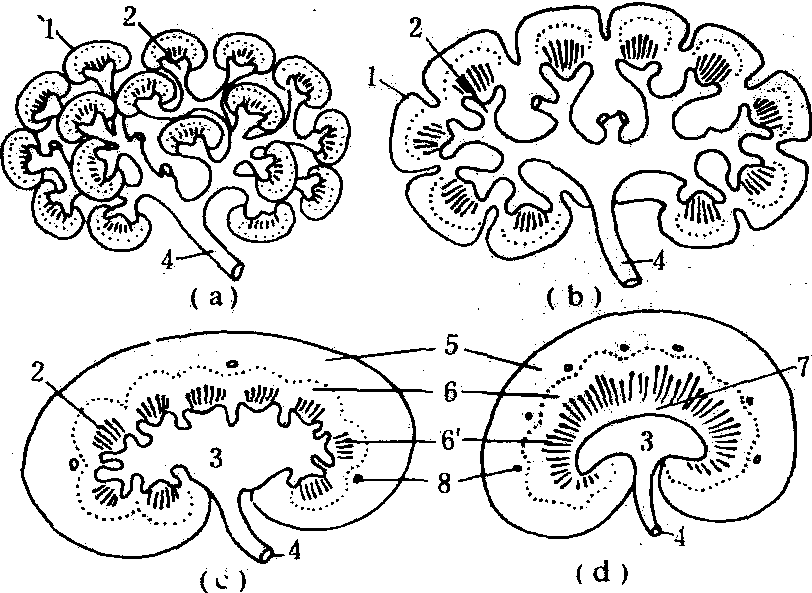 | 释义 | 肾kidney五脏之一。位于腰部,左右各一。临证中一般称肾脏为内肾, 睾丸为外肾。肾的病变常反映到腰部,故有“腰为肾之府”之说。由于肾藏精,主管机体的生长、发育和生殖, 所以称“肾为先天之本”。其经脉络膀胱, 与膀胱相表里。 肾kidney脊椎动物体内具有排泄作用并参与维持身体内环境恒定的重要器官。肾由无数上皮性小管构成,并具有丰富的血管。哺乳类成体的肾在脊椎动物系统发生上属于后肾(见泌尿系统),上皮性小管可分为泌尿部和排尿部两大段,前者又称肾单位,两者来源不同,但在尿的形成过程中都有重要作用。一般哺乳动物的肾在胚胎发生时形成若干锥体形的肾叶,尖端称肾乳头; 后来在有些动物有不同程度愈合,因而形成四种基本类型(图1):❶复肾,肾叶不愈合,见