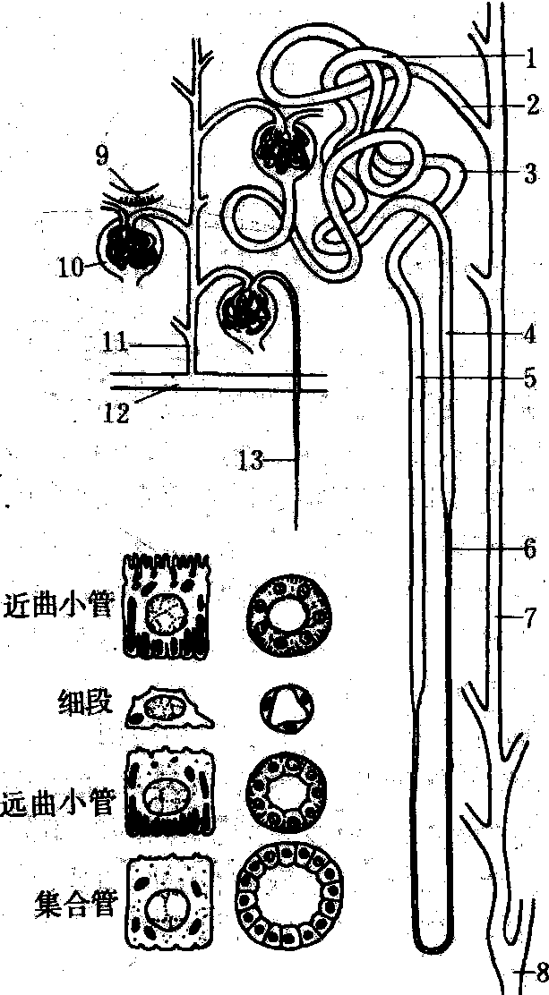 图 2 哺乳动物的肾单位 1. 近曲小管; 2. 连接管; 3. 远曲小管; 4. 近曲小管(直部); 5. 远曲小管(直部); 6. 细段; 7. 集合管; 8. 乳头管; 9. 致密斑; 10. 肾小体; 11. 小叶间动脉; 12. 弓状动脉; 13. 直小动脉 肾小体 由肾小囊和肾小球构成。肾小囊为双层球形囊,由肾小管的盲端膨大、凹陷形成,囊内包有一团毛细血管,称肾小球。囊的壁层(即外层)由单层扁平上皮构成。脏层(即内层)的上皮细胞则演变为特殊的足细胞,具有若干大的初级突起,再由初级突起发出许多小的次级突起,称为足突,贴附在肾小球的毛细血管基膜上。相邻细胞的足突彼此相嵌,而以宽约2.5nm的裂隙分开,称滤过裂隙; 裂隙上封闭有厚仅5~6nm的裂隙膜,类似有孔毛细血管上的隔膜。肾小囊的壁层与脏层间为狭小的囊间隙,在肾小体的一端(尿极)与肾小管相通。肾小球的在肾小体的另一端(血管极)有一支输入小动脉进入肾小囊,分成数支,再形成一些毛血管襻,盘曲为肾小球,最后汇合成一支输出小动脉出肾小体。肾小球的毛细血管属于有孔毛细血管,小孔直径50~100nm,数量较多,且大多无隔膜;有孔毛细血管、基膜和裂隙膜构成了滤过屏障。由于输入小动脉略粗于输出小动脉,因此肾小球中的血压较高; 在输入小动脉管壁中的平滑肌,收缩时可调节肾小球中的液体压力。这些都是肾小体超滤过作用的物质基础,超滤液称为原尿(见尿)。在肾小球的毛细血管襻间另有一种星形的系膜细胞,可能有支持和吞噬作用。 近曲小管 为肾单位中最长、最宽、最发达的一段,盘曲于肾小体邻近。管壁由单层立方上皮构成,细胞顶面具有发达的微绒毛,形成所谓刷状缘; 细胞间以许多侧突交错嵌合; 在细胞的基底面也形成许多突起交错相嵌,突起内含有长形线粒体,成为在光镜下见到的基底纹。近曲小管是将原尿中许多物质包括水分等重吸收的部位,此外还能排泄某些代谢废物和吸收入体内异物。此段也易受到疾病和有毒物质的影响。 亨利氏襻 为近曲小管从皮质的髓放线进入髓质后再折返皮质的部分,因此又称髓襻。呈发夹形,分为降支和升支,由三部分构成,即近曲小管直部、细段(又称中间段)和远曲小管直部。襻的长短因肾单位的肾小体所在位置而有不同。肾小体在皮质浅部的肾单位,襻只达髓质的外带,其细段很短,位于降支上;肾小体在皮质深部的肾单位,襻较长,达髓质的内带,其细段很长,参与形成降支和升支。两类肾单位的比例因动物种类而有不同,一般短襻的肾单位稍多。曲小管直部即襻的粗段由单层立方上皮构成,细段由单层扁平上皮构成。 远曲小管 为亨利氏襻升支入皮质后盘曲形成,较短; 与肾小体和近曲小管同位于皮质迷路内,最后以短的连接管与集合小管相接。管壁也由单层立方上皮构成,但仅有稀少的微绒毛,因而不形成刷状缘:细胞底部也形成基底纹。 远曲小管除重吸收Na+外,还分泌H+和NH3,对维持血液的酸碱平衡起一定作用。远曲小管的起始段在与肾小球输入小动脉相接触处,上皮细胞呈柱状,胞浆少而核排列紧密,形成所谓致密斑。 肾小球旁复合体 由肾小体血管极处的球旁细胞、致密斑以及邻近的球外系膜细胞 (又称极垫) 组成。球旁细胞是输入小动脉管壁中平滑肌演变成的 “上皮样”细胞,对输入小动脉压敏感,当其较低时能分泌肾素,通过一系列连锁作用,使肾小管主要是远曲小管增加对Na+和Cl-以及水分的重吸收,从而增加循环血量使血压升高。致密斑则是一种化学感受器,能感受远曲小管中液体的容量和钠离子含量,反映给肾小体并调节肾素的分泌。 肾排泄管 是肾实质排尿部的导管系统。第一段是许多短的弓形集合小管,与远曲小管相连续,另一端则陆续注入髓放线中的直形集合小管。后者下降入髓质并陆续汇合,至髓质的内带再汇集而成乳头管,开口于筛区。集合小管由单层立方至低柱状上皮构成,在脑垂体后叶产生的抗利尿激素影响下,能让水自由通过,促进水的重吸收; 由于肾髓质组织中较高的渗透浓度,原尿浓缩成为终尿。乳头管由单层柱状上皮构成。在发生上,肾实质的排尿部是与肾盏、肾盂和输尿管一起由中肾导管末段的输尿管原基即输尿管芽演生而来,再与泌尿部的肾单位一一接通。如未能接通,许多肾单位因积尿而呈囊状,称为多囊肾,属先天性发育障碍。 血液供应和神经支配 肾具有丰富的血液供应,血流量占心输出量20~25%,相当于每天每克肾组织有1 500毫升,远高于体内其他组织。肾动脉直接由主动脉发出,从肾门进入后分支为若干叶间动脉行于肾锥体之间,然后分支并折转为弓状动脉而行于髓质与皮质交界处。从弓状动脉上,垂直分出许多小叶间动脉进入皮质迷路,沿途发出一系列短的输入小动脉,入肾小体形成肾小球。在皮质外周部的肾小球的输出小动脉,又分支形成毛细血管丛,包绕皮质内的肾小管。而近髓质部的肾小球的输出小动脉,则形成直小动脉下降至髓质,然后急转成为直小静脉,折向皮质行,注入弓状静脉。直小血管的管壁很薄,直小静脉的内皮是有孔的,与亨利氏襻紧密邻接,它们对髓质中组织间液的高渗浓度的形成有重要作用。肾静脉除无与肾小球相当的静脉成分外,其他分支基本与动脉伴行,汇合后出肾门直接注入后腔静脉。 肾淋巴管在纤维囊和血管周围形成毛细淋巴管网。肾皮质内的肾小球无淋巴管,肾小管间则具有毛细淋巴管网。髓质内的毛细淋巴管以盲端