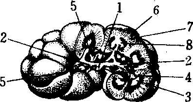 图1 表面有沟多乳头肾〔牛肾(部分剖开)〕 1.输尿管 2.集收管 3. 肾乳头 4. 肾盏 5. 肾窦 6. 纤维膜 7.皮质 8.髓质