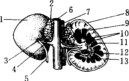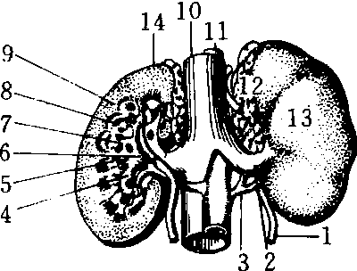 图2 表面光滑单乳头肾〔猪肾(腹侧面,右肾剖开)〕 1. 左输尿管 2. 肾静脉 3. 肾动脉 4. 肾大盏 5. 肾盏 6. 肾盂 7. 肾乳头 8. 髓质 9. 皮质 10. 后腔静脉 11. 腹主动脉 12. 肾上腺 13. 左肾 14. 右肾
