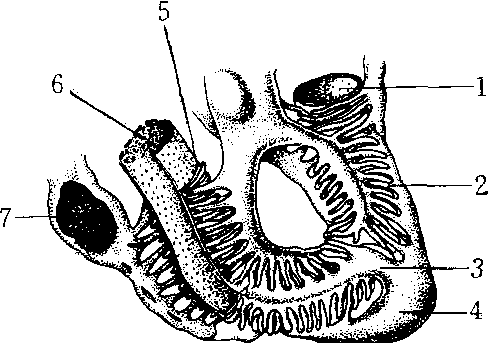 肾小体足细胞与毛细血管的关系 1.内皮细胞 2.足细胞的小突起 3.足细胞的大突起 4. 足细胞胞体 5. 基膜 6.内皮小孔 7. 足细胞核 |