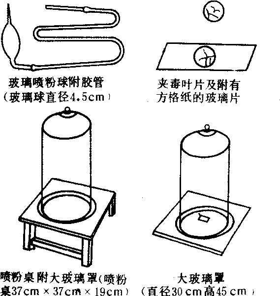 叶片夹毒法 根据试虫吞食的夹毒叶片面积,来计算取食药量的测定方法。适用于取食大的植食性咀嚼式口器昆虫,如粘虫、斜纹夜蛾、玉米螟、家蚕等。此法由坎贝尔(F. L. Campbell)于1929年提出。优点是可减少试虫与杀虫剂接触,避免发生触杀作用,操作方便,结果比较精确,但计算吞食面积费时间。方法是: ❶采用喷粉(或喷雾)法将一定量杀虫剂均匀地施于叶片上,另用一张大小相同未处理的叶片,涂上浆糊,小心地覆盖其上做成夹毒叶片,以不同大小的叶片(不同药量)饲喂已知体重的试虫嚼食,然后将剩余叶片移置于有坐标纸的玻璃片上,在放大镜下观察计算所吞食的叶面积,计算吞食药量(见图)。并给试虫喂以新鲜无毒叶片,置于恒温恢复室