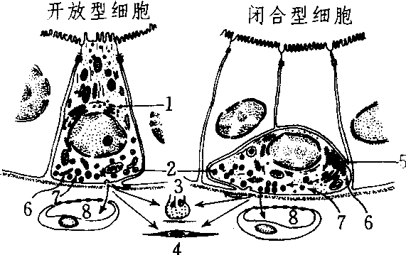 胃肠道内分泌细胞结构和功能 1.高尔基复合体 2.分泌颗粒 3.神经 4.肌纤维 5.粗面内质网 6.氨基酸 7.胺 8. 血液 |