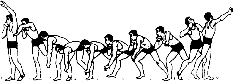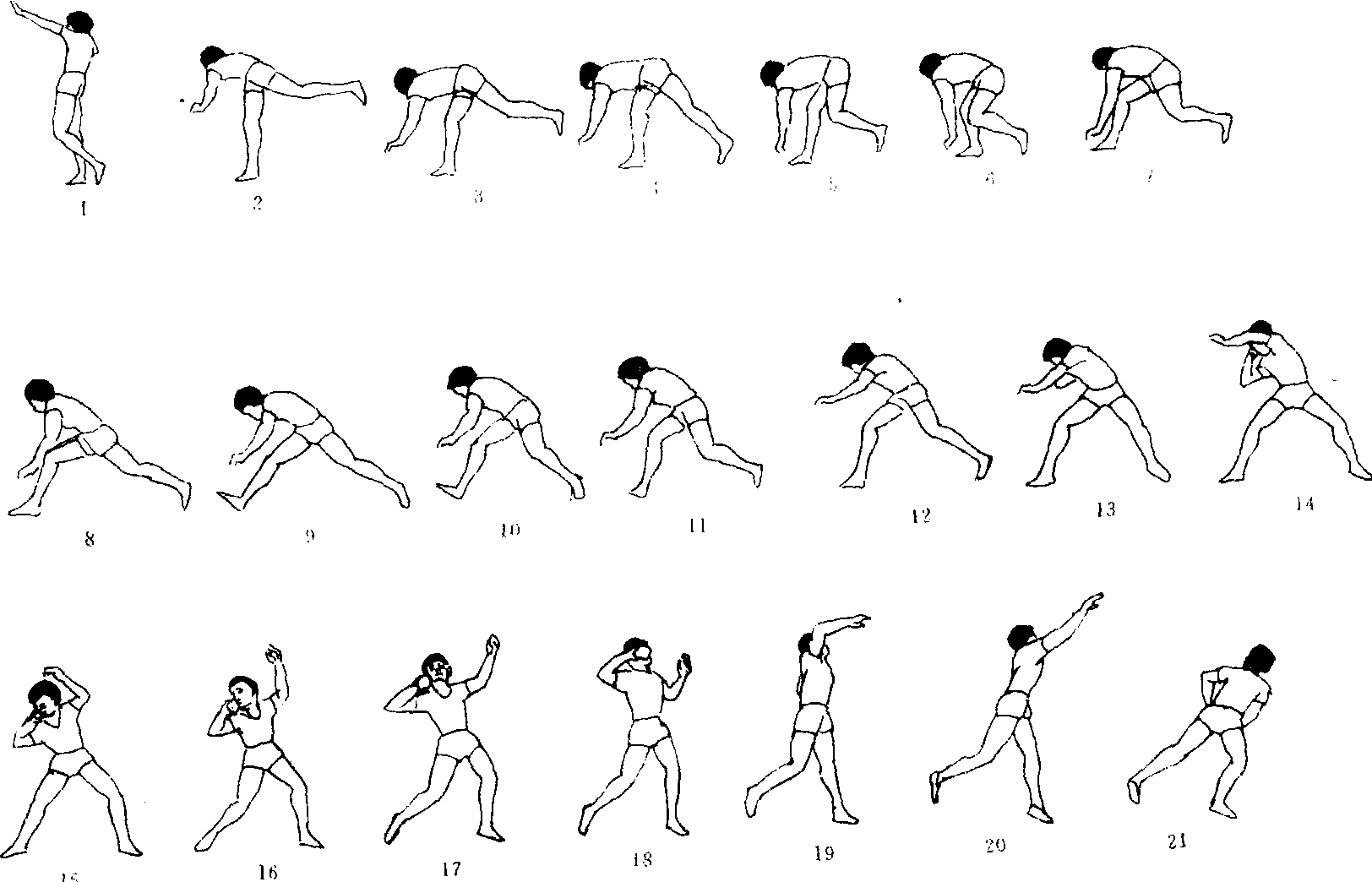 动作要领 (以右手投掷为例)❶预备姿势。持球后背对投掷方向,两脚前后开立,右脚在前以全脚掌着地,脚尖贴近投掷圈内沿,脚跟正对投掷方向,左脚在后自然弯屈,以脚尖或前脚掌着地,上体正直,右肘略低于肩,左臂自然上举,重心落在右脚上,两眼看前下方。 ❷预摆与滑步。左腿向后上摆起,上体自然前俯,左臂自然伸于胸前;左腿回收,右腿弯屈,上体前俯接近水平, 头与背在一条直线上。当左膝回收靠近右膝时,右膝弯屈,臀部微向后移,形成有利于快速向后滑步的团身姿势。右腿用力蹬伸,左腿以大腿带动髋,快速向抵趾板中间偏左方向摆出。右脚以前脚掌 (或脚跟)用力蹬离地面后,快速收小腿,同时右膝、脚内扣,以前脚掌在圆心附近着地,与投掷方向成90°—135°。左大腿积极下压,脚尖稍外展带动髋向左转动,以脚内侧落在投掷圈中线左侧靠近抵趾板处,与投掷方向约成45°。重心落在右腿上,左肩内扣,左臂后伸内旋,铅球投影点远离支撑点,形成良好的最后用力姿势。 教学重点 ❶最后用力技术。参见推铅球的最后用力。 ❷背向滑步技术。采用徒手背向滑步模仿,从高处向下滑步或持球背向滑步等练习,以体会背向滑步技术。 ❸衔接技术。可采用徒手或持球滑步与最后用力结合,滑步推铅球练习,以体会滑步与最后用力的衔接技术。 |