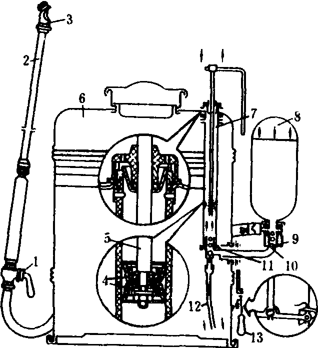 背负式喷雾器 1.截流阀;2.手持喷杆;3.喷头;4.皮碗;5.塞杆;6.药液箱;7.唧筒;8.空气室;9.出水球阀;10.出水阀座;11.进水球阀;12.吸液管;13.摇杆 |