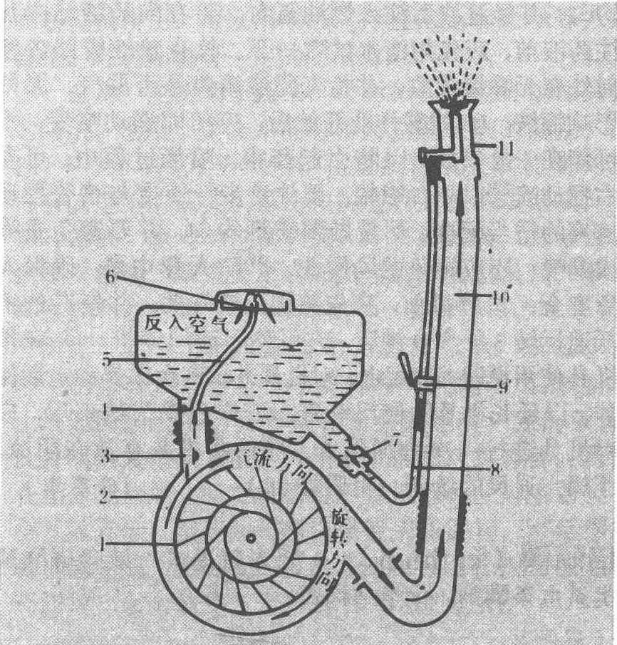 背负式气力喷雾机工作原理示意图 1.风机叶轮;2.风机外壳;3.进风阀;4.进气塞;5.软管;6.过滤网;7.出水塞接头;8.输液管;9.开关;10.喷管;11.喷头小型高速离心风机、药液箱、喷管部件、输液管、喷头等部件组成。其工作原理如上页图所示。汽油机带动风机的叶轮旋转产生高速气流,其中一小股气流经进风阀、进气塞、软管,进入药液箱,迫使药液箱内的药液经出水塞接头、输液管、开关至喷头喷出,然后被喷管内的高速气流冲击雾化成细小的雾滴,吹向靶标。 影响因素 影响背负式气力喷雾机雾化性能的主要因素是喷管内的气流速度、喷口处的气液比及药液的物理性质。喷管内的气流速度越高,气流对药液的雾化能力越强,雾滴越细。而喷管内的气流速度取决于高速离心风机的风量。当喷管直径一定时,风机的风量越大,喷管内的气流速度越高,机具的雾化性能越好。气液比(流经喷管的气体量与供液量的体积比)愈大,雾滴直径愈小。但当气液比大到一定值,再继续增大供气量时,雾滴直径不再继续变小。药液的物理性能中,主要是表面张力和粘度对雾滴直径有影响。表面张力大的药液,形成的雾滴直径较大; 粘度大的药液,形成的雾滴直径也较大。反之,形成的雾滴直径较小。 使用方法 背负式气力喷雾机的一般使用方法与操作步骤是: ❶起动前,检查各零部件的安装是否正确、牢固。并根据防治对象,选择适宜的喷头。进行大田喷雾作业时,宜采用扩散型喷头; 喷洒果树及较高树木时,宜采用缩口型喷头。对于新开箱的机具或封存较久的机具,应先排除汽油机缸体内积存的机油。 ❷加注燃油时,汽油与机油应按规定比例混合,搅拌均匀,并经过滤后注入燃油箱内。 ❸在向药液箱内加注药液前,应先用清水试喷一下,检查输液管路各密封处有无渗漏现象。并检查药液箱盖是否漏气。漏气影响输液。 ❹喷雾作业开始后,应随即摆动喷管,不可停在一处喷洒,以防引起药害。喷洒过程中,可左右摆动喷管以增加喷幅。要注意步行速度与喷管摆动速度的适当配合,尽量做到喷洒均匀,并要避免重喷或漏喷。还应避免逆风作业,严防人身中毒,确保人身安全。 ❺停机前,应先关闭药液开关,并使汽油机低速运转3~5分钟后,方可关闭油门停机。 ❻应按机具使用说明书的规定,对机具进行班次保养和定期保养,以延长机具的使用寿命。 ❼作业季节结束后,应对机具进行一次全面保养,然后将机具存放在阴凉、干燥、通风的场所。(见彩图88) |