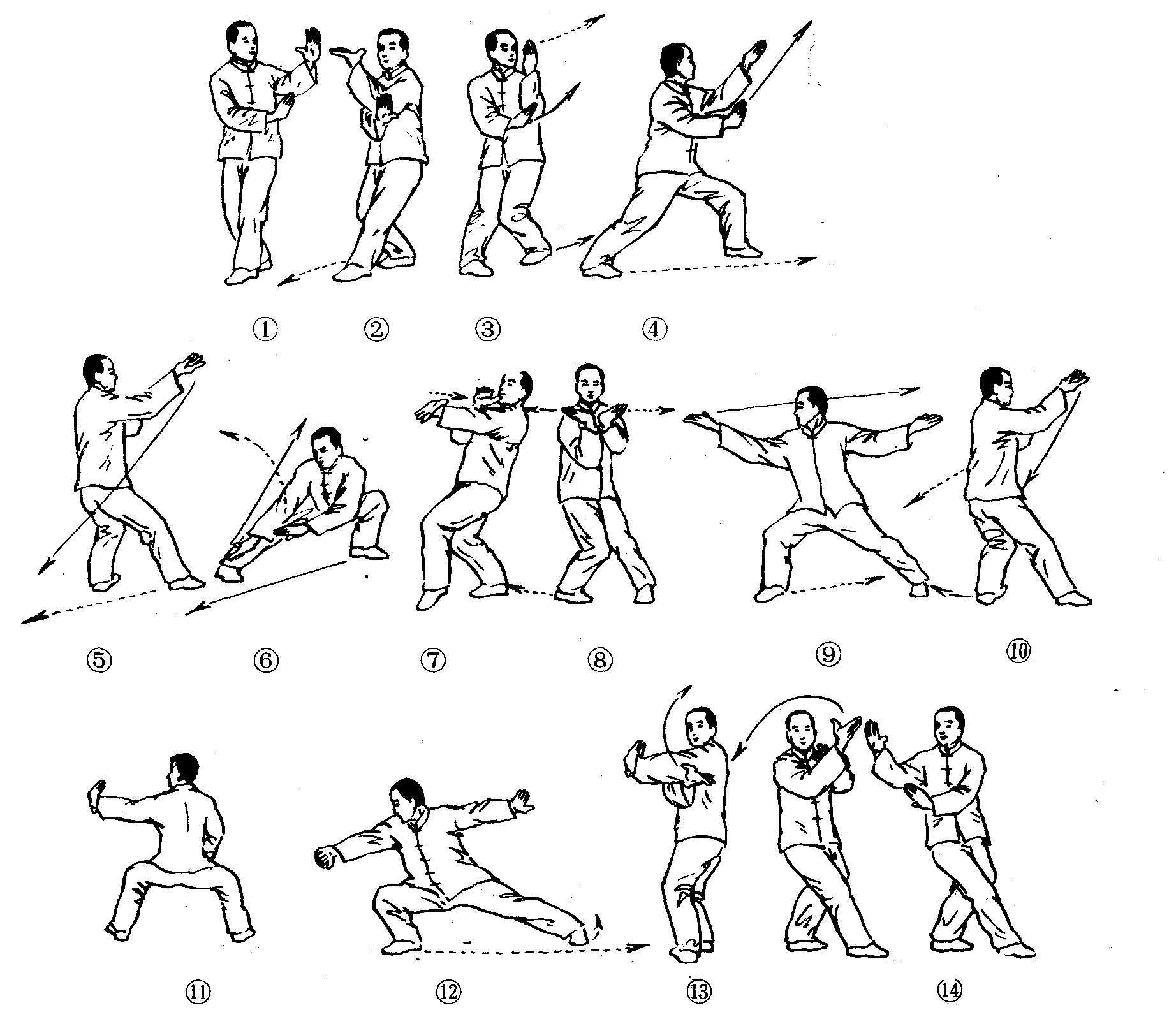 ❿推山入海:上体稍向左转;左脚向左移步坐身成马步势(面对圆心);同时左掌向内翻转,掌心朝外,掌指朝圆心,向身体左侧横掌蹋出;右掌向内翻转,掌心朝下,按至腹前;眼看左掌方向。(图2—4—76—(11))(11)走马活携:上体向右转,重心移至右脚;同时,右掌掌心朝外,掌指朝圆心,向右横掌蹋出;左掌随之外撑;目视右掌。(图2-4-76-(12))(12)金龙抱柱:上体向左后转,左脚尖外摆;右脚蹬地,向左脚前进步成金龙抱柱。(图2-4-76-(13))(13)青龙探爪:上体向右拧转,右脚向右前进步,成右势青龙探爪。(图2-4-76-(14))动作要领:迈步和穿掌要同时完成。注意事项:老年初学者练习燕子抄水时,动作起伏不宜太大。