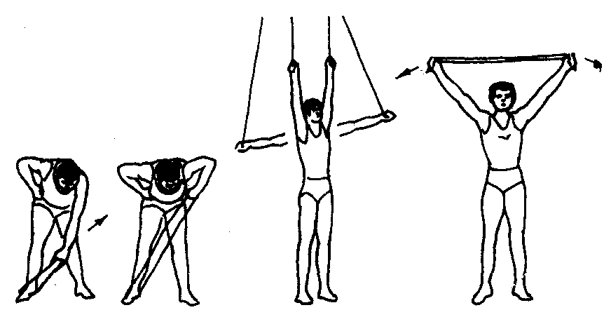 ❶下拉:俯卧在体操凳上,橡皮条一端固定在与肩同高的物体上,两臂头上举,两臂同时(或交替)向下拉到与身体成垂直的部位,也可继续后拉到大腿旁。❷弓身划船:体前屈站立。单臂(或双臂)向侧上拉引弹性物体至体侧。(图2—3—103)❸直臂侧下压:两脚左右开立,两臂上举握住在头上方固定的橡皮条,然后两臂向侧下拉压到大腿两侧。(图2—3—103)❹两臂头上侧平拉:可将拉力器放置在头后做,也可放在脸前做,要求直臂侧下拉压,使两臂靠近大腿两侧。