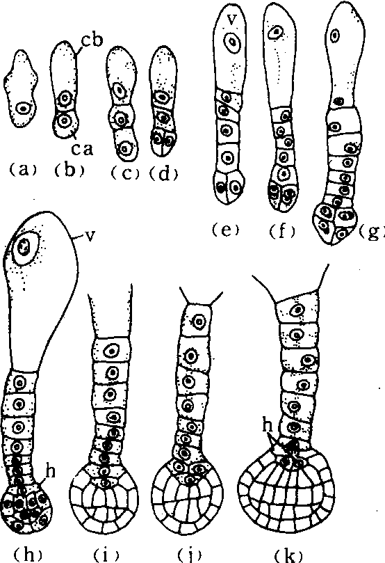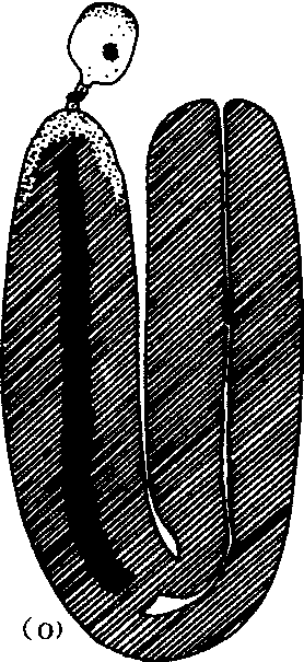 单子叶植物胚的发育与双子叶胚的发育最初相似。显著不同是双子叶植物在球形胚以后发育出2个子叶原基,胚芽生长点居于2个子叶之间,而单子叶植物只有1个子叶,胚芽生长点居于子叶一侧。 胚发生的类型 根据合子第一次为横分裂或纵分裂以及顶细胞的分裂方向和基细胞是否参加胚体的构成,将胚胎发生分为6种主要类型: Ⅰ. 合子纵分裂为2个细胞……胡椒型 Ⅱ. 合子横分裂为顶细胞 (合点端)和基细胞(珠孔端) 1. 顶细胞纵分裂 A. 基细胞不参加或很少程度上参加胚体的形成……柳叶菜型或十字花型 (柳叶、菜科、十字花科、梓树属、薄荷属、百脉根属、毛茛科的鼠尾巴属、芸香属、百合属、灯心草属) B. 顶细胞基细胞均参加胚体的形成……紫菀型(菊科、 𪻒牛儿苗科、 百合科、酢浆草科、早熟禾亚科、蓼科、蔷薇科及荨麻科的一些属) 2. 顶细胞横分裂 A. 基细胞在胚体形成中不起重要作用 a. 基细胞不分裂……石竹型 (石竹科、小二仙草科、景天科等) b. 基细胞分裂……茄型(茄科、亚麻科、山茶科、桔梗科、罂粟科、茜草科) B.基细胞或多或少参加胚体建成……藜型(藜科、紫草科、苋科、花葱科等) 胚柄的结构和功能 ❶胚柄将胚体推进胚乳中,使其处于有利的营养环境; ❷有些植物的胚柄细胞增大或形成吸器,穿入胚乳组织或胚珠组织,起着吸收养料转移至胚体的作用; ❸胚柄细胞与胚乳相邻及与珠被绒毡层相邻的壁有内突(荠菜、菜豆属、豇豆属、豌豆),具传递细胞特征,说明胚柄可从周围组织吸收营养转运至胚体或分泌物质至胚的生长部分; ❹某些植物的胚柄细胞核为高度多倍性,菜豆属胚柄基部巨大细胞有多线染色体或巨型染色体,可能有提供大量DNA模板和增加细胞的合成能力。 胚❶种子或颈卵器内由受精卵发育形成的植物幼体。某些被子植物胚囊中未受精的卵、反足细胞和助细胞,甚至蕨类植物原叶体的营养细胞也能发育成胚。有胚芽、胚根、胚轴和子叶的分化。 胚embryo❶受精卵在母体内发育形成的多细胞雏形植物体。苔藓植物、蕨类植物、种子植物的生活史中能形成胚,它们属于有胚植物。苔藓和蕨类的胚结构比较原始,种子植物的胚发生于种子中,有明显的两极分化,一般分化为胚芽、胚根、胚轴、子叶4个部分。 |