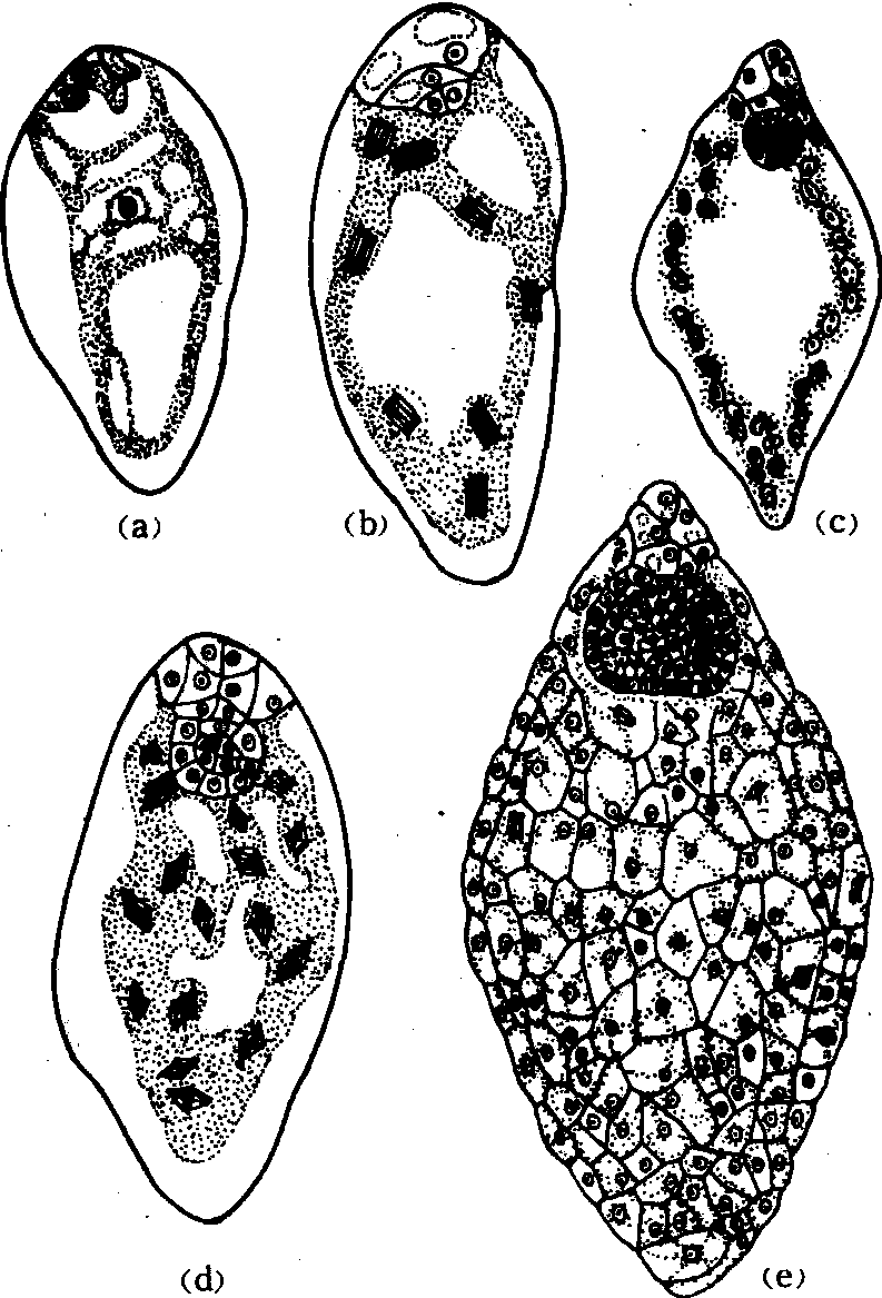 许多学者分别对向日葵、繁缕、小麦和绣球百合(Haemanthus katherinae)等进行了观察,认为游离核之间的细胞壁来源于胚囊壁的突起,称为自由生长壁,与成膜体及细胞板无关。自由生长壁分枝,又互相连接而形成一层胚乳细胞 (小麦) 或数层胚乳细胞(绣球百合),以后胚乳细胞的增生,则为胚乳细胞行有丝分裂的结果,这样的细胞壁形成是与成膜体和细胞板有关的。但有的研究者认为小麦胚乳游离核之间的初始垂周壁和平周壁不是自由生长壁,同样是与成膜体或细胞板有关。 细胞型胚乳 初生胚乳核及以后核的各次分裂均伴随细胞壁的形成,无游离核时期。第一次分裂形成的壁通常是横向的,也有的是纵向的。 沼生目型胚乳 这种胚乳发育方式兼有上述二种类型的主要特点。初生胚乳核的第一次分裂形成两个细胞: 一个小的合点室和一个大的珠孔室。珠孔室按核型胚乳方式发育,形成胚乳组织; 合点室核保留不分裂或只进行少数几次分裂,维持游离核状态或退化,有的植物亦可形成细胞。沼生目型见于单子叶植物的某些类群。 有的植物有胚乳吸器,是胚乳的一部分,从合点端、珠孔端或从侧面侵入珠心组织,有从周围组织吸收营养物质运输到胚乳的功能。豆科和葫芦科植物普遍有胚乳吸器,吸器处于游离核状态或由细胞组成,形状多种多样。某些植物的胚乳吸器细胞有壁内突,具传递细胞的功能。 胚乳通常为三倍体,但由于内多倍性,往往为混倍体。核仁一至多个,有的核仁物质流出至核质或细胞质,被认为是核糖体或RNA从核内转入细胞质。胚乳核可以增大,这是由于形成多线染色体(玉米)或由于染色体数目增加(顶冰花属)或由数核合并(棉花、小麦、大葱)的原因。有些胚乳核还能进行无丝分裂,或发生各种不正常的有丝分裂。小黑麦的皱缩颖果与不正常胚乳核的数目相关。紫露草属、扇叶树头榈、绣球百合等杂种无性系果实的败育,主要由于胚乳退化。 胚乳的作用 ❶为胚的发育及萌发提供营养; ❷红花菜豆、菜豆及豇豆的胚乳,在珠孔端与珠被绒毡层相邻处,以及胚柄周围的胚乳细胞均有壁内突,具传递细胞特征,表明有向母体组织吸收和转运养料供胚发育的功能; ❸含有多种激素,对胚胎生长、形态发生可能具有调节作用; ❹胚乳的低渗透势陡度可能为胚的正常发育所必需,并可能抑制胚的过早萌发。 胚乳又称“内胚乳”。种子的组成部分之一。贮藏营养物质。在种子萌发时供作胚的养料。被子植物的胚乳是由受精的两个极核在胚囊内发育而成。如水稻、玉米、蓖麻、柿等,这类种子称有胚乳种子。而大豆、蚕豆等,在种子成熟过程中,胚乳已被消耗,养料贮存于胚的子叶内,称无胚乳种子。裸子植物的胚乳是由大孢子直接发育而成,起源上不同于被子植物。有些植物如苋、石竹等,胚囊外面的珠心发育成类似胚乳的贮藏组织,称外胚乳。 胚乳endosperm被子植物中,由中央细胞两个极核受精后发育而来的一种营养组织;裸子植物中,直接由不经受精的雌配子体延续而来的营养组织。胚和幼苗生长发育初期所需养料的库源。被子植物的受精极核首先发育为初生胚乳核,通常为三倍体。但由于胚囊类型的不同,胚乳核有不同染色体数,或因胚乳的内多倍性,往往还可形成混倍体。被子植物胚乳根据其发育形态特征,分为核型、细胞型和沼生目型3种类型。在胚乳的发育过程中,有些植物的胚乳逐渐为发育中的胚所吸收,待种子成熟时已无胚乳存在,如豆科、十字花科植物。有些植物的胚乳组织发达,种子萌发时,才为胚逐渐吸收,所以成熟种子中含有胚乳,如水稻、大麦、蓖麻等。 |