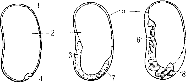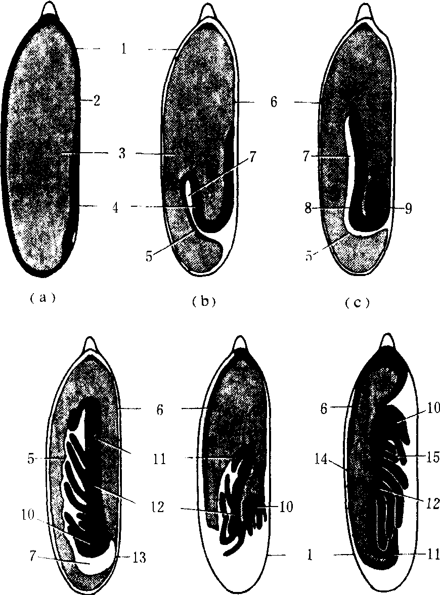 鳞翅目昆虫的胚动,又是另一种形式,其移动的范围很广。当胚带继续伸长,沿着卵形弯曲,腹面向外,随着胚体分节,附肢发生和体壁形成等变化时,胚带逐渐缩短,外表上胚胎腹面的轮廓已显明,这时的胚胎腹面仍然弯向卵的外方,胚胎附肢向外,贴近卵壳(见卵生胚胎发育图8)。胚胎缩短变直之后,即逐渐向相反方向反转,先从尾部开始,渐至头部。完成胚动后,胚胎弯向内方,而胚胎背面则弯向卵壳外。未背合胚体仍与卵黄相接触,羊膜与羊膜腔则随着体壁形成与在胚动过程中扩大。由于胚体继续长大和伸长,致使头部叠置于腹部后端的背面。这种胚动形式,仅存在于鳞翅目昆虫。 |