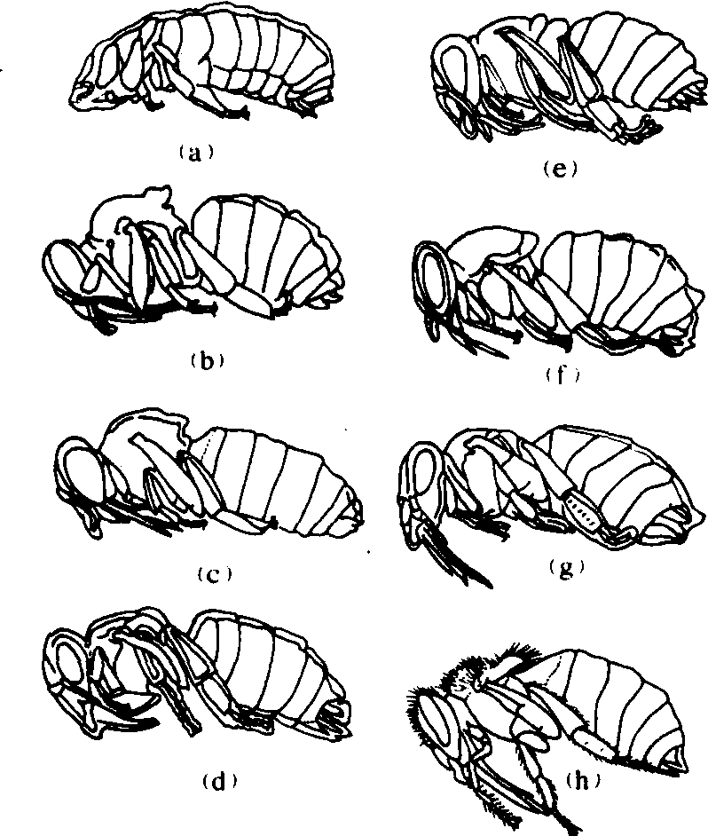 图1 蜜蜂的幼虫 蛹 在蛹期,幼虫的组织器官经分化和改造,逐渐形成成虫的各种器官(图2)。在幼蛹期,触角,足和翅已展开,呈白色略透明,渐变黄褐色。复眼和成虫的口器也出现,但各胸、腹节还保留着幼虫的特征。雌蛹腹末有螫针的原基。在较后一个时期,幼蛹仍在幼虫表皮内,但中胸节已胀大,胸部和腹部之间还未缩窄分开,复眼粉红色。至蛹成熟时,并胸腹节形成,腹部明显分开。同成虫相像。腹部末端第8~10节内陷,螫针形成,复眼紫红色。成熟蛹摆脱幼虫表皮,外部不再改变,而内部仍继续分化。当成虫在蛹内完全形成时,蛹壳裂开,咬开巢房盖羽化出房。