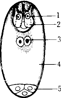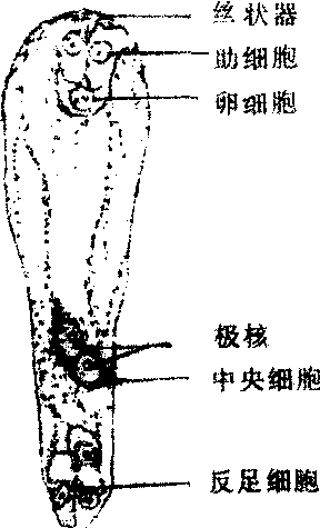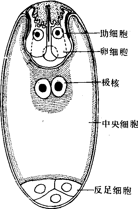 成熟胚囊的结构 1. 助细胞 2. 卵细胞 3. 极核 4. 中央细胞 5.反足细胞 |