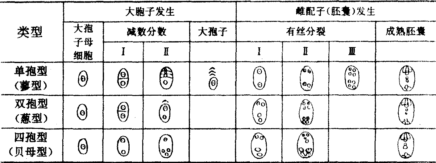 图556 胚囊发育的三大类型 胚囊embryo sac被子植物的雌配子体,存在于胚珠中。绝大多数植物的胚囊为8核7细胞结构:1个卵细胞,2个助细胞,3个反足细胞和1个具2个极核的中央细胞(见图)。
