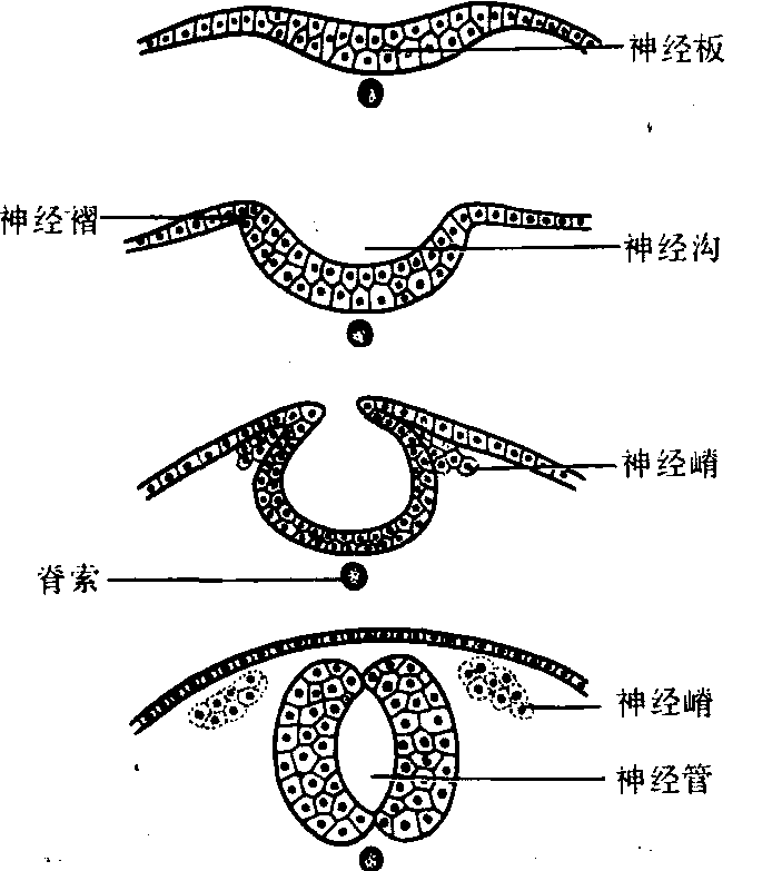 外胚层的分化 起初,在原肠胚背部外胚层在脊索和轴旁中胚层诱导下,加厚形成神经板,随着脊索延长,神经板增宽、伸长,同时中央凹陷为神经沟,两侧隆起为神经褶;左、右神经褶相向愈合成为神经管(图1)。神经褶愈合的同时,有些神经板外侧的细胞成为神经嵴,夹于神经管和外胚层之间。神经管和神经嵴进一步分化为中枢和周围神经系,其余外胚层则分化为表皮及其衍生物,还有各天然孔的粘膜上皮及其腺上皮等。