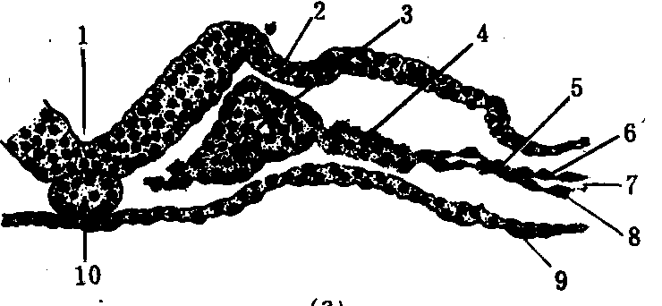 (a)前期 1. 神经沟; 2. 外胚层; 3. 上段中胚层; 4. 中段中胚层;5. 下段中胚层;6. 体壁中胚层;7. 体腔; 8. 脏壁中胚层; 9. 内胚层; 10. 脊索