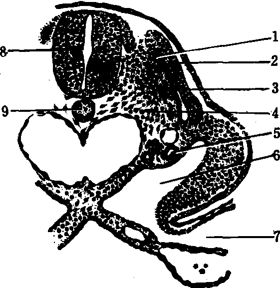 (b)后期 1. 生肌节; 2. 生皮节;3. 生骨节; 4. 间充质;5. 中肾管; 6. 胚内体腔; 7. 胚外体腔; 8. 神经 管;9. 脊索