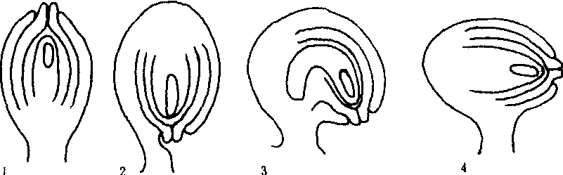 | 释义 | 胚珠peizhu胚珠是种子植物所特有的器官,受精后发育成种子。裸子植物的胚珠外面无包被,即裸露的,如松柏类植物球果的果鳞,向轴面上有两个裸露的胚珠;被子植物的胚珠发生在子房内,由子房壁包被,胚珠着生在胎座上。一个子房中含有胚珠的数目因植物种类不同而异,如桃只有一个胚珠,而棉有多个胚珠。胚珠由珠心、珠被、珠柄和珠孔组成。珠心是发生在胎座上的一团胚性细胞,是胚珠的中心部分,珠被包围在珠心的周围。珠被包围珠心时在顶端留一小孔,为珠孔。胚珠基部与胎座连接的部分叫珠柄。胚珠中珠被与珠心的汇合处位于珠柄之上的部位叫合点。胚珠形成过程中,由于各个部分生长快慢的不同,而使胚珠的形态上有两种主要类型。一是直生胚珠,胚珠的各个部分生长均匀一致,所形成的珠孔、合点和珠柄在一条直线上,如荞麦(图18,1);二是倒生胚珠,胚珠形成时,两侧珠被生长不一致,一侧快一侧慢,结果胚珠向生长慢的一侧弯曲180°,而使珠孔与珠柄平行,同时珠柄与内侧的外珠被结合形成珠脊,大多数被子植物具倒生胚珠(图18,2)。另外还有介于上述两者之间的类型,如横生胚珠(图18,4)、曲生胚珠(图18,3)等。多数植物珠被为两层,是双珠被胚珠,有些植物只有一层珠被,是单珠被植物,如向日葵。