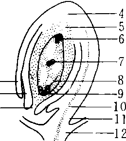 成熟胚珠的结构 1. 外珠被 2. 内珠被 3. 珠孔 4. 合点 5. 珠心 6. 反足细胞 7. 极核 8. 卵细胞 9. 助细胞 10. 维管束11. 珠柄 12. 胎座 |