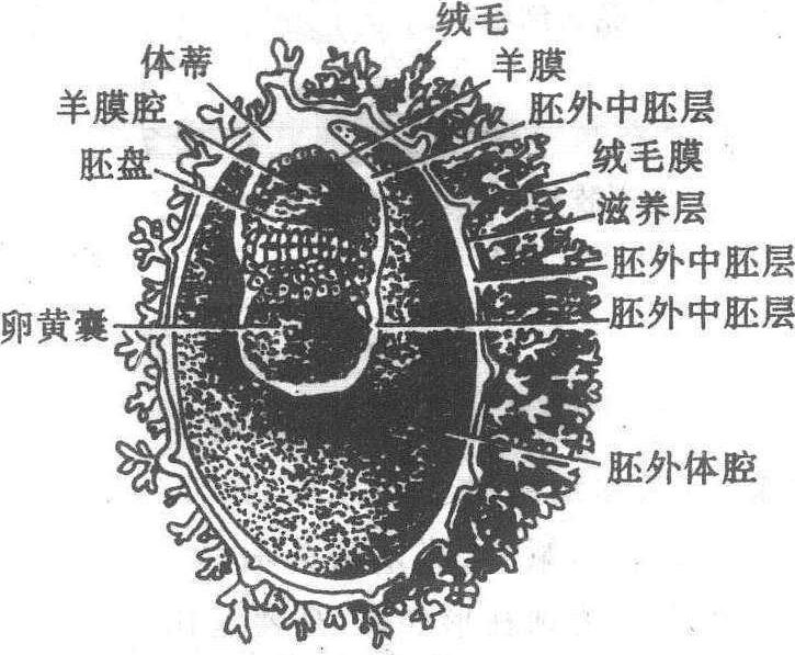 | 释义 | 胚盘形成在胚泡植入过程中,滋养层发生了很大变化,与此同时,胚泡里面的内细胞团也发生了变化。于第2周末,在内细胞团中分化长出一个两层细胞的胚盘,它的形状是扁盘形的,将来发育为胚胎(见图2.4-2)。随着植入过程的进行,内细胞团细胞分裂增殖,在靠近胚泡腔的一侧,形成一层整齐的立方形细胞,称为原始内胚层。在内细胞团和滋养层之间出现一个裂隙为羊膜腔,由细胞滋养层分化来的细胞形成羊膜腔的顶,将演变为羊膜。羊膜腔底部内细胞团的细胞为胚盘的原始外胚层。内细胞团原始内胚层周边的细胞向胚泡腔方向繁殖、增生并迁移,形成一个由单层扁平细胞围成的囊,叫卵黄囊。羊膜腔底部的原始外胚层和卵黄囊顶部的内胚层这两层细胞组成一个扁盘,称为胚盘,将来发育为胚胎。与此同时,从细胞滋养层分离出一些细胞沿胚泡腔形成一层排列疏松的细胞,称为胚外中胚层,贴于滋养层内面,并包裹在羊膜和卵黄囊的外面。原来的胚泡腔现称为胚外体腔。在羊膜顶部有一部分胚外中胚层与滋养层相连,这部分胚外中胚层称为体蒂,它是形成脐带的基础。第2周末,胚卵的构造为1个大球中挂着2个小球。外面的大球由滋养层构成,在滋养层表面形成许多细小的绒毛,此时滋养层改称绒毛膜,里面的2个小球是羊膜囊和卵黄囊,2个小球靠体蒂将它们连在绒毛膜上,并互相压在一起,这就是第2周末由两层细胞构成的扁盘形人胚的位置。