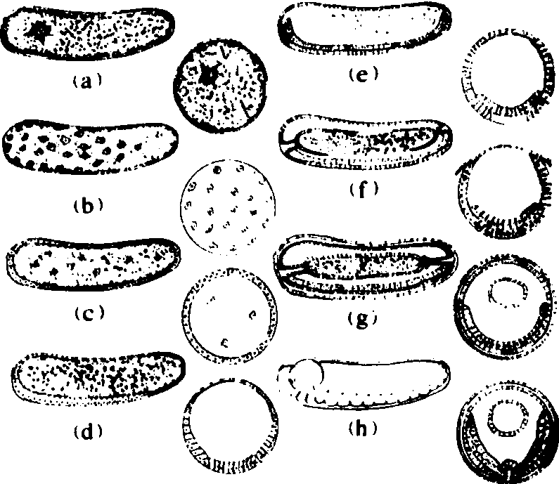 蜜蜂胚胎发育过程(左为纵切面;右为横切面) 胚体分节及附肢形成 当中胚层即将形成时,胚体开始分节。分节最初从头端开始,逐渐向后发展,共分18胚节。第1节为头叶,最宽大;第2~4节为口节;第5~7节为胸节; 其后的11节即第8~18节分别为第1~10腹节及尾节。在胚体伸长及分节的同时,口节和胸部开始出现附肢芽, 口节的3对附肢分别发育成上颚、下颚和下唇;胸部的附肢形成3对胸足,胸足不发达。同时,头叶出现4个突起,中央两个愈合形成上唇,两侧的两个形成触角。腹部不出现附肢芽。 体壁形成及背合 当中胚层出现后,外胚层即形成胚胎腹面的体壁,然后体壁经两侧向上伸展,首先在胚胎两端体壁在背中线相接呈圆筒状,随后向中央扩展,直至前后相接,背合过程即告完成。 主要器官的形成 分述如下: 消化道的形成 当羊膜形成以后,在胚胎的两端前、后中肠韧的位置各出现一个凹陷。前(头)端为口道,进一步凹陷形成前肠;后(尾)端为肛道形成后肠。口道和肛道的形成把前后中肠韧向内推移,中肠韧开始增长,包围卵黄的两端呈杯形,两端各自伸出一个舌状突,围绕卵黄的上方向中央延伸,直到相接形成一完整的带状物。此带再经两侧向下扩展,最终在腹中线相接,形成包含卵黄在内的中肠。中肠此时盲闭,和前、后肠不接通。 神经系统的形成 由外胚层形成。胚层分化刚完成时,外层腹面中央细胞的细胞核明显增大,形成明显的纵带,称为中索。中索下面中央内凹,形成神经沟,神经沟两侧则形成两列神经柱,神经柱进一步形成神经母细胞和表层细胞,神经母细胞形成神经节和神经连索。神经节最初是成对形成的,后合并为一,前后神经节由神经连索相联,横向的神经分支由中索一群细胞形成。最初的胚节除末节外其余17个都有一对神经节。头叶的神经节最大,发育成脑,其后3节(口节)的3对神经节合并成食道下神经节。胸部保留3个神经节。第1~7腹节各有一个神经节,最后一个为复合神经节,由第8~10腹节的三对神经节合并而成,位于第9腹节。感觉器官由外胚层细胞特化而成,感觉神经由感觉神经原产生,向内增长进入神经节;运动神经由腹神经索里的神经原发生,外伸分布于肌肉组织中。 气管系统的形成 由体壁内陷而成。胚体分节以后,第3、第5~14胚节两侧分别出现一对凹陷,除第1对凹陷最后消失外,其余10对凹陷分别发育成各节的气门。这些凹陷进一步向内扩展,并伸出管状分支,相邻各节的分支纵向连接形成气管主干,同节左右两侧的分支横向伸展并连接形成背面和腹面的横走气管。第3胚节同样地形成头部的气管系统,并向后伸出分支和第5胚节前伸的分支相连,从而气管主干伸入到头部。第3胚节凹陷在胚胎后期消失。 循环系统的形成 由中胚层形成。中胚层形成以后,其两端分别产生一个小空洞——体腔囊,体腔囊不断扩大直至几乎完全占据血腔。后来大部囊壁破裂,裂解的组织形成肌肉和脂肪组织,体腔囊和血腔就合并为一复合腔,仍称为血腔。囊壁侧面的一部分细胞不断裂,形成心原细胞,心原细胞形成两个半月形的成心肌细胞群,后在背中线合并成管状。背隔由心原细胞侧面分出的一群中胚层细胞形成;腹隔由左右腹纵肌发出的肌纤维相连而成。 生殖系统的形成 由中胚层形成。腹部末端两侧的中胚层细胞形成生殖脊,生殖脊形成生殖腺。原始生殖细胞内胚盘中一类特殊细胞形成。(见胚前发育)。 胚胎发育见个体发育。 胚胎发育一般指受精卵发育至幼体孵出前或胎儿出生前的雏形动物体的发育过程。高等动物的胚胎发育在体外(两栖类、爬行类、鸟类等卵生动物)完成或在母体子宫内(胎生动物)完成。一般分为卵裂、囊胚、原肠胚(包括中胚层形成)以及器官的分化发育等几个发育阶段。 |
