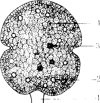 地钱的胞芽 1.胞芽柄 2. 油细胞 3. 产假根细胞 4. 绿色细胞 |