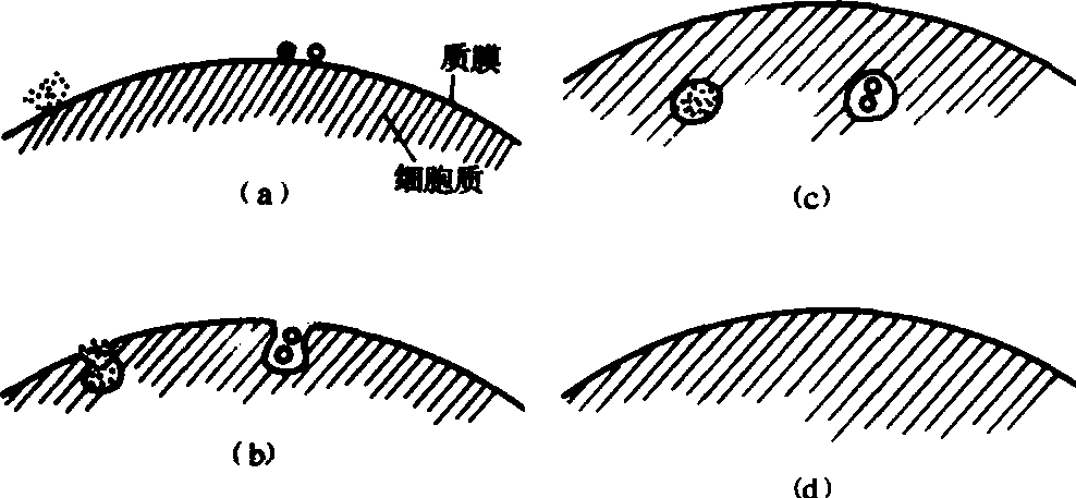 胞饮作用及胞吞作用示意图 (a)质膜外吸附大分子及液滴;(b)质膜在吸附大分子及液滴的部位内陷; (c)质膜内陷部位形成的小囊泡进入细胞质;(d)小囊泡膜溶解。 其内含物转移到细胞质中 吸收膜外吸附的溶液或物质。例如大分子或分子的聚集体(molecular aggregates),如图所示。一般胞饮作用是指以这种方式吸收液体微滴的过程,胞吞作用是指吸收大分子或分子聚集体的过程,但有时也用胞饮作用或胞吞作用泛指通过质膜内陷吸收膜外所吸附的物质的过程。通常这种过程在矿质养分吸附中的作用不大,但胞饮作用或胞吞作用为大分子的吸收提供了一种可能的机理。 |
