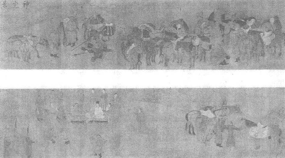 | 释义 | 胡瑰卓歇图卷五代。胡瑰绘。绢本设色,纵33厘米,横256厘米。北京故宫博物院藏。胡瑰,契丹人,或云为慎州乌索固部落人。生卒年代不详,约生活于唐末及五代初年,定居范阳(今河北涿县)。善画鞍马、人物,尤长于表现本部落的游牧生活。画技工巧细密,《五代名画补遗》中称,“其于穹庐部族,帐幕旗饰,弧矢鞍鞯,或随水草放牧,或在驰逐弋猎,而又胡天惨冽,沙碛平远,能曲尽塞外不毛之景趣。”可见,胡瑰是一位以表现番骑题材而著名的少数民族画家。此图描绘契丹可汗与王公贵族出猎之后在坡岗间歇息、饮宴的情景。所谓“卓歇”,系指立帐歇息或立而暂息的意思。图中,契丹可汗与其阏氏(可汗的妻子)盘坐于毡毯之上,正在饮宴。可汗身穿契丹服,年轻潇洒;阏氏身著汉装,风度俨然,他们身后,男女侍从分列左右。筵前还有奉酒的,献花的,舞蹈的,奏乐的,情绪热烈而又秩序井然。随同可汗一齐狩猎的王公大臣聚在坡岗一侧,或席地而坐,或倚马而立,有人牵着马匹,有人卸下杂物,准备支架帐篷。马鞍上驮着鹅雁等猎物。猎手们一个个显示出疲惫倦怠的神色。人群背后是渺漠荒寂的土岗沙丘,见不到一株绿树,表现出北方荒原间的自然风貌。此图笔法严谨,线条细密,墨色匀和,画风质朴,有突出的民族特色。幅中无作者款印,引首有清人张照书题“番部卓歇图”及清高宗弘历手书的“卓歇歌”,幅中有“神完景足”四字赞语,后纸有王时、高士奇、张照题记。全卷共钤鉴藏印章30方,《江村书画目》、《石渠随笔》、《石渠宝笈续编》著录。