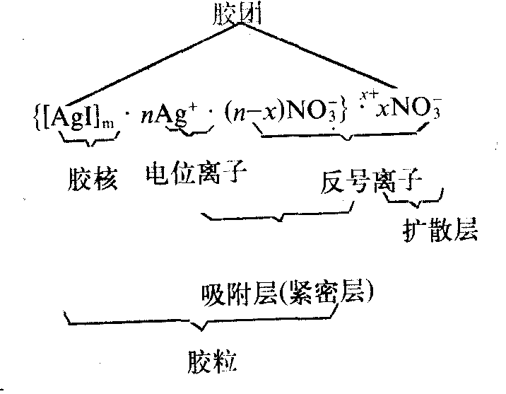 | 释义 | 胶粒结构jiaoli jiegou在胶体溶液中,表面上吸附有离子的分散相粒子称为胶粒。如AgI正溶胶示意如下: