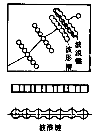 对承受较大载荷的零件也应采用一些补强措施。最简单的方法是在开出的V型槽底部点焊若干处之后粘补,波浪键粘接—扣合法可满足一般强度要求的机件修复。此法在垂直裂纹方向上加工出一定形状和尺寸的波形键槽(一般是在裂纹上钻孔,再用凿子开出头颈槽使各孔连起来而成),在槽内涂上胶粘剂,再把由特殊合金材料制成的形状与波形键槽相吻合的波浪键嵌入(图),用锤子铆击,使波浪键产生塑性变形而充满槽腔,借胶粘剂使波浪键凸缘与槽相互扣合,将损坏的机件重新牢固地连接为一体。