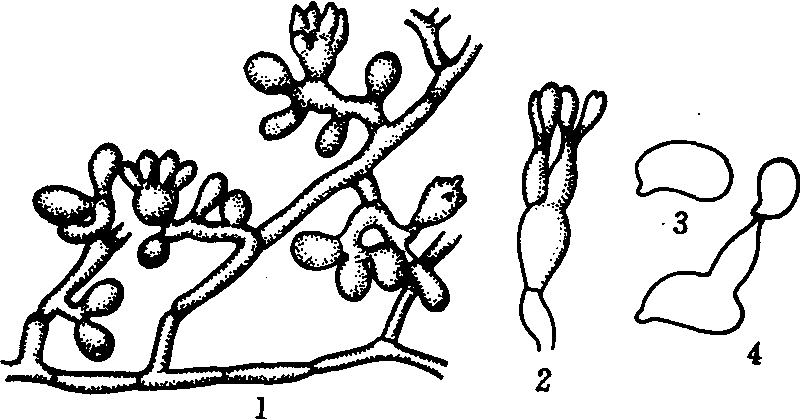| 释义 | 胶膜菌目Tulasnellales担子果平伏呈一薄层、担孢子可重复产生的一类无隔担子菌。属于担子菌亚门、层菌纲。该目真菌的担子果蜡质或胶质,蛛丝状,白色或灰褐色; 子实层不连续,很少呈明显栅栏状; 担子近球形至棍棒形,无隔膜,顶端4个小梗呈粗指状或明显膨大,易脱落或不脱落; 担孢子单细胞,壁薄,表面光滑,能萌发产生次生担孢子。已知9属,约50种。寄生、腐生或与植物共生形成菌根。无性孢子不详,有些种具丝核菌属的无性态。以往把这类真菌归人有隔担子菌亚纲、银耳目的一个科。贝西(ErnstAthearn Bessey)1950年根据担子的特点,将它归入无隔担子菌亚纲,独立成为胶膜菌目,分为2个科:❶胶膜菌科。担子具有明显膨大的小梗,小梗与担子之间有一横隔膜,成熟时小梗可脱落(图1)。