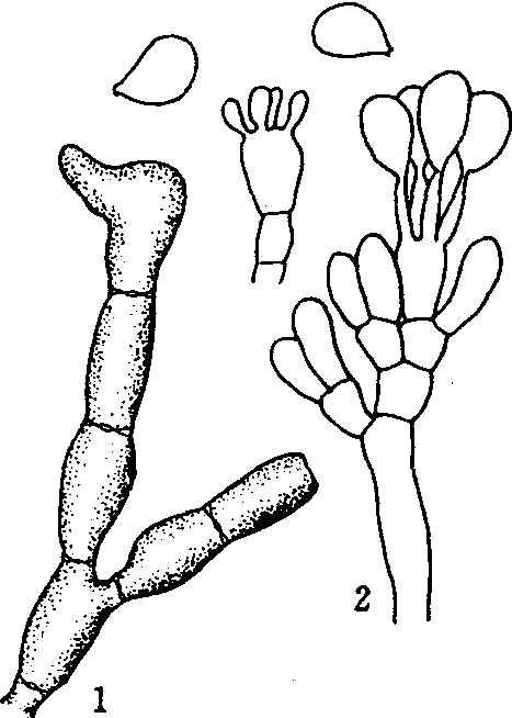 亡革菌属(Thanatephorus Donk) 担子比支撑菌丝稍宽,近圆筒形至桶形或倒卵形; 担孢子椭圆形,一侧扁,无色至淡色(图2)。无性态为丝核菌属(Rhi-zoctonia)。瓜 亡革菌[T.cucume-ris(Frank) Do.nk]是立枯丝核菌(R.solani Kühn)的有性态,可形成松软的菌核。寄主范围很广,能引起很多种树苗和农作物的立枯病。该菌在各种出版物中出现的异名有瓜纹枯菌、茄伏革菌、丝核薄膜革菌(Hypochnus cucumeris,Corticium solani,Pellicularia filamentosa)等。