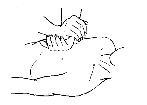 | 释义 | 胸外心脏按压法是用人工的方法,有节律地在胸腔外部间接地按压左右心室,使血液流入主动脉和肺动脉,建立有效的大小循环,来代替心脏的自主收缩,是对心跳骤停病人有效的现场抢救方法之一。操作方法病人必须仰卧在硬板床或地上,操作者双手交叉重叠,下面一手的掌跟部放在病人胸骨下1/3即胸骨中线与两乳连线的相交处(图2—2—21)。以拇指跟部为轴心手指翘起不接触病人胸壁,臂伸直,依靠操作者的体重、肘及臂力,有节律地垂直施加压力,使胸骨下陷3~4厘米,然后放松解除压力使胸骨复原(图2—2—22)。按压时将左心室中血液排出,解除压力后,血液进入左心室为一被动过程,需要一定时间,因此按压时间为1/3放松的时间为2/3。对小儿按压时可用一只手掌跟部加压,新生儿用2~3手指加压。按压的次数成人为每分钟80~100次,小儿酌情。按压时力量与深度要适当,不可用力过猛以免造成肋骨骨折。按压的有效指征是可以摸到大动脉的搏动,收缩压在60毫米汞柱以上,面色口唇由灰白转为粉红色,散大的瞳孔缩小和出现自主呼吸。心脏按压与人工呼吸同时进行时为每按压4~5次进行一次人工呼吸。
