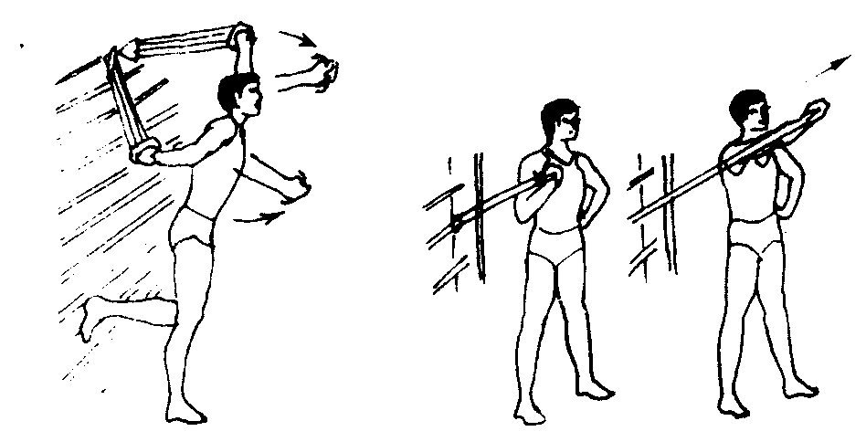 ❶站立飞鸟练习:背对肋木单腿站立,一腿后蹬肋木,两臂侧前拉至胸部前方。(图2—3—102)❷单臂前上拉:背对肋木站立,掌心向胸部,前上拉弹性物体。(图2—3—102)❸卧推:仰卧在体操凳上作:两臂上举至胸部上方伸直;单臂上举至胸部上方伸直。❹双臂侧前拉:仰卧,两臂头上举。两臂同时(或交替)拉到大腿旁,随后经体侧弧形向上至两臂头上举。