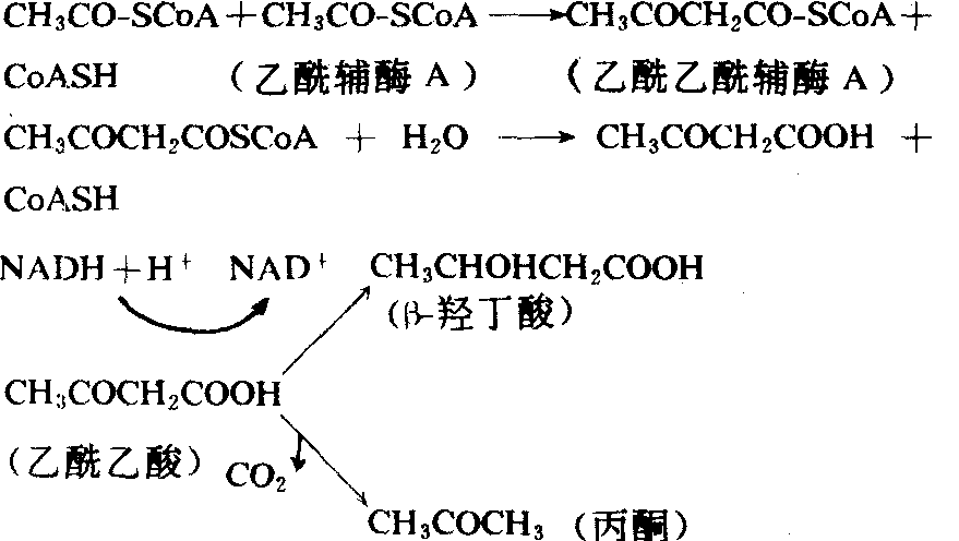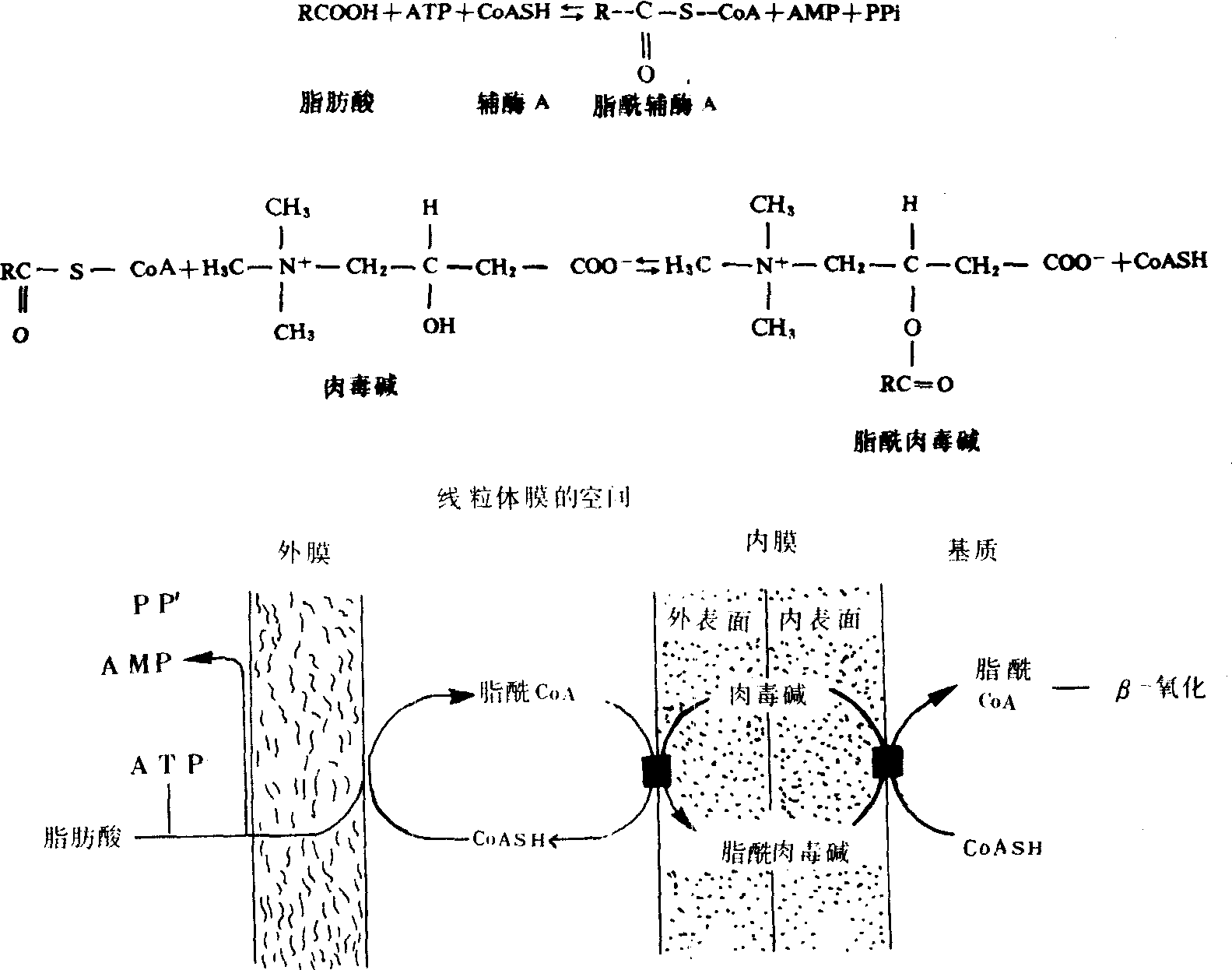 图536 由细胞质至线粒体中β-氧化部位传递图解 脂肪酸的氧化分解可有几种方式,但以β-氧化最为重要。所谓β-氧化就是不断在脂肪酸的β碳原子处发生氧化裂解,最终全变成二碳单位的过程,脂酸在ATP参与下“活化”成脂酰辅酶A后,经脱氢、水化、脱氢、裂解等4步酶促反应,生成1分子乙酰辅酶A及1分子碳链短两个碳原子的脂酰辅酶A。此碳链较短的脂酰辅酶A,又经过同样的系列酶促反应,生成乙酰辅酶A。如此重复进行,脂肪酸最终全变成乙酰辅酶A分子。催化第1次脱氢反应的脱氢酶是一种黄素蛋白,反应后其辅基FAD变成还原型FADH2。第2次脱氢反应由一种烟酰胺脱氢酶催化,反应后其辅酶烟酰胺腺嘌呤二核苷酸(NAD+)也变成还原型NADH。每分子FAD·H2进入呼吸链氧化可生成2分子ATP,每分子NADH进入呼吸链则可生成3个ATP分子。可见除脂肪酸活化时消耗ATP外,每产生1个二碳单位便可产生5个ATP分子,在脂肪酸β-氧化阶段已可产生不少机体可以利用的能。脂肪酸β-氧化所产生的乙酰辅酶A,可通过三羧酸循环和呼吸链彻底氧化成CO2和水。1分子含18碳的饱和脂酸(硬脂酸),最终可产生9分子乙酰辅酶A。3分子葡萄糖也含18个碳原子,却只能产生6分子乙酰辅酶A。仅粗略比较,也可看出:脂肪的产能效率比糖高。在人类和大多数哺乳动物的肝脏中,脂肪酸氧化产生的乙酰辅酶A有两条分解途径。一是通过三羧酸循环氧化成CO2和水,并产生能量。另一途径是,2分子乙酰辅酶A缩合成乙酰乙酰辅酶A,后者脱去辅酶A后还原生成β-羟丁酸或脱羧生成丙酮。乙酰乙酸、β-羟丁酸和丙酮统称为酮体。