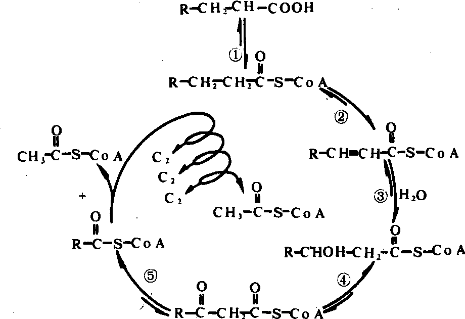 脂肪的缩合过程:先是在磷酸甘油转酰酶催化下,α-磷酸甘油与2分子脂酰CoA形成β-甘油磷酸二酯;β-甘油磷酸二酯经磷酸酶作用脱去磷酸后,再与1分子脂酰CoA反应(二酰甘油转酰酶催化)生成三酰甘油,即脂肪。 脂肪的分解 脂肪在脂酶的作用下,可水解成甘油和脂酸。甘油在甘油激酶和ATP作用下生成α-磷酸甘油,α-磷酸甘油可进一步在磷酸甘油脱氢酶作用下生成磷酸二羟丙酮。磷酸二羟丙酮是糖酵解过程的中间产物,它可循酵解途径变成丙酮酸,再经三羧酸循环,最后氧化成CO2和水,同时放出能量。脂酸是通过氧化作用分解的。氧化方式有β-氧化、α-氧化和ω-氧化等,但以β-氧化为主。β-氧化指从脂酸羟基端的β-碳原子开始的氧化作用,为克努普(F.Knoop)1904年首先提出,其后并得到证实和发展。脂酸的β-氧化包括下列步骤:❶脂酸在脂酰CoA合成酶作用下,与CoA形成脂酰CoA,这一反应消耗一分子ATP; ❷脂酰CoA在脱氢酶作用下脱氢,形成反式α,β-烯脂酰CoA,脱下的氢将氧化态黄素腺嘌呤二核苷酸(FAD)还原成还原态黄素腺嘌呤二核苷酸(FADH2); ❸反式α,β-烯脂酰CoA在水合酶作用下转变成β-羟基脂酰CoA; ❹再经脱氢酶作用形成β-酮脂酰CoA,并将氧化态烟酰胺腺嘌呤二核苷酸(NAD+)还原成NADH+H+; ❺最后在硫解酶的作用下,生成乙酰CoA和比原来的脂酰CoA缩短2个碳原子的脂酰CoA。上述过程周而复始。每循环一次,脂酸链缩短2个碳原子,并形成一个乙酰CoA,直至整个脂酸分子分解完毕。乙酰CoA经三羧循环氧化成CO2和水,并放出能量(图2)。