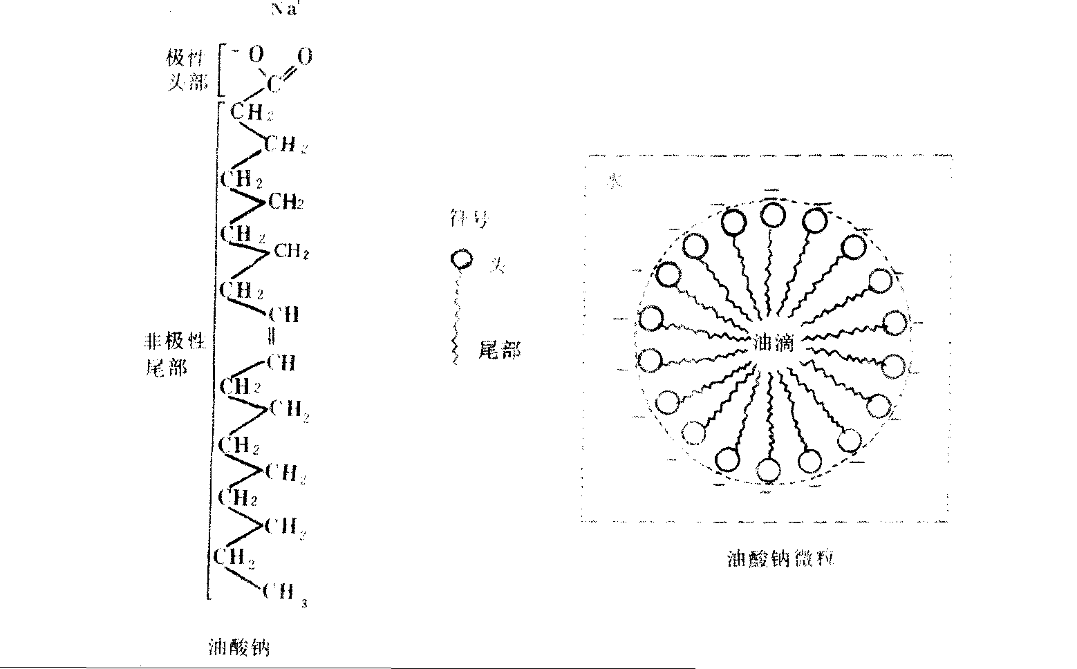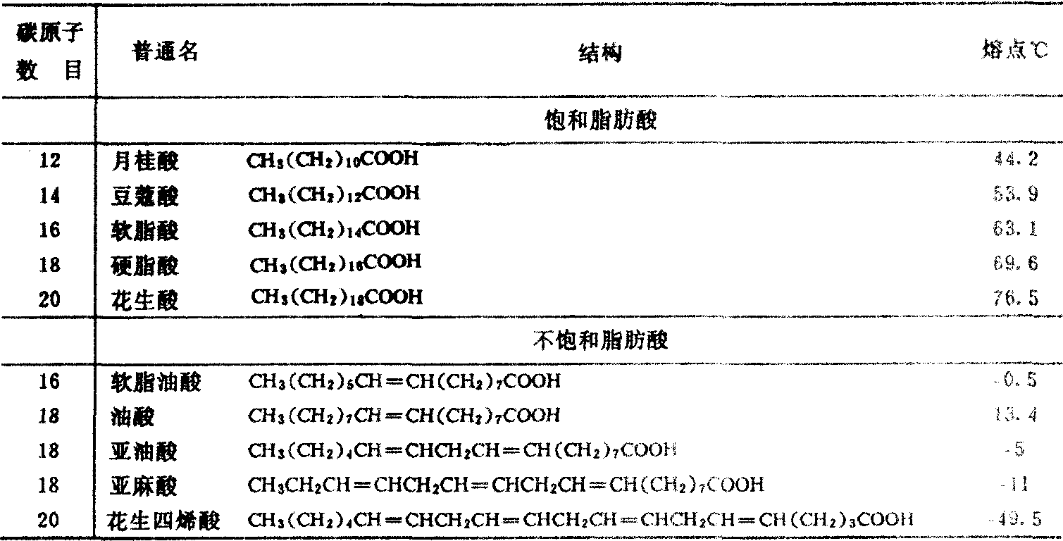 图535 皂微粒在水中 从上表可看出:饱和脂肪酸的熔点比不饱和脂肪酸的熔点高;在饱和脂肪酸中,长链脂肪酸的熔点又比短链脂肪酸的熔点高。具有奇数碳原子的脂肪酸虽在陆生动物中仅有微量存在,但在许多海生生物中却有相当大的数量。哺乳动物能从其他前身物合成饱和的脂肪酸和单烯脂酸,但不能制造亚油酸和亚麻酸,必须从富含它们的植物中获得。这些哺乳动物饮食中必需的脂肪酸,叫做必需脂肪酸。植物中不存在花生四烯酸,哺乳动物能从亚油酸合成它。脂肪酸不溶于水,但在NaOH或KOH中转变成脂肪酸盐(皂)后,能形成微粒分散在水中。浴皂就主要是脂肪酸钾盐的混合物。钾皂或钠皂是亲水脂分子:离子化的羧基是极性“头”,而碳氢链是非极性“尾”。皂分子的疏水尾趋向避开水而藏于微粒的内部,其极性头则朝向水并与之相互作用。每个微粒含有成百上千个皂分子。这些微粒都带负电荷,互相排斥,所以可均匀地分散在水中、皂液显得浑浊,是因为皂分子形成的微粒相对较大,并散射光的缘故。钾皂或钠皂有乳化油性、水不溶物(包括脂肪)的性质。皂分子的疏水尾进入油滴而其极性头面向水,这样,在油滴周围形成亲水的外壳,使油滴能均匀地分散在水中,生成稳定的乳浊液。脂肪酸存在于脂类中的一类长链羧酸。化学本质可看作是链状烃类分子中一个氢被羧基取代的衍生物。根据其分子中存在双键与否可分为饱和与不饱和脂肪酸。天然脂肪中脂肪酸均为双数碳原子的脂肪酸。 脂肪酸fatty acid脂肪烃基(R-)与羧基连接而成的脂肪羧酸。通式为