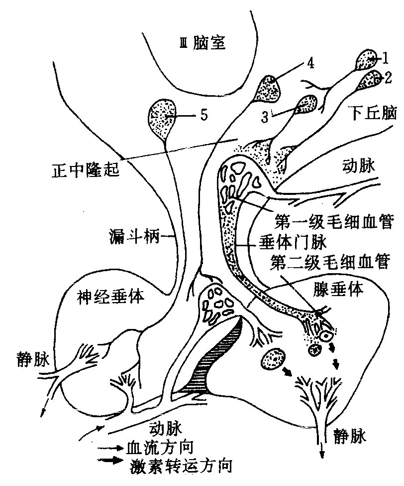 脑下垂体悬垂于脑的底面,体积很小,重量不到1克,但结构复杂,在形态和功能上与下丘脑有密切联系(见图1.10-2)。脑下垂体分为腺垂体和神经垂体两部分。腺垂体由许多腺细胞组成,至少分泌七种激素,它们的化学本质都是蛋白质或多肽,其中有四种激素是调节其他内分泌腺功能的,称为促激素,包括促甲状腺素(TSH)、促肾上腺皮质激素(ACTH)、两种促性腺激素,即卵泡刺激素(FSH)和黄体生成素(LH)。甲状腺、肾上腺皮质的束状带和性腺(卵巢和睾丸)分别是上述促激素的靶腺。促激素不仅调节其相应靶腺的激素的合成与释放,而且维持靶腺的正常生长发育。当某种促激素分泌不足时,则相应靶腺的功能减退,腺体萎缩。相反,如果促激素分泌过多,则引起相应靶腺的功能亢进,腺体增大。腺垂体分泌的另三种激素为生长激素(GH)、催乳素(PRL)和黑色素细胞刺激素(MSH),它们不通过靶腺而直接起调节作用。腺垂体的功能受下丘脑的调节、下丘脑内有一些具有内分泌功能的神经元,它们所分泌的激素通过下丘脑垂体门脉系统的血液循环到达腺垂体,刺激或抑制腺垂体激素的分泌,分别称为释放激素或释放抑制激素(或因子)。目前已知的有促甲状腺素释放激素(TRH)、促肾上腺皮质素释放激素(CRH)、促性腺激素释放激素(GnRH)、生长激素释放激素(GRH)和生长激素释放抑制激素(GRIH或SS)以及催乳素释放抑制因子等。腺垂体促激素的分泌除受下丘脑的调节外,还接受外周靶腺分泌的激素的反馈调节。这种功能联系称为下丘脑-腺垂体-靶腺轴。生长激素(GH)为由191个氨基酸残基构成的蛋白质激素,有种属特异性,除猴以外,其他动物的生长激素对人均无效。GH的主要生理功能为: