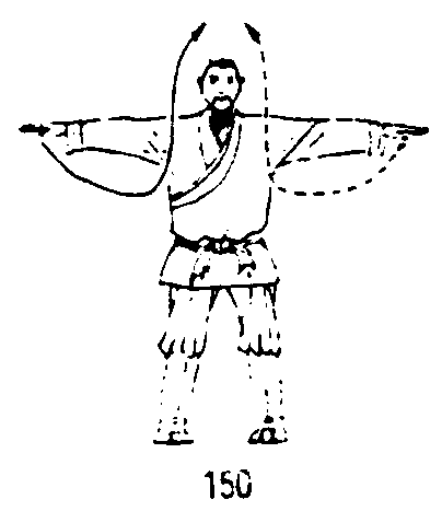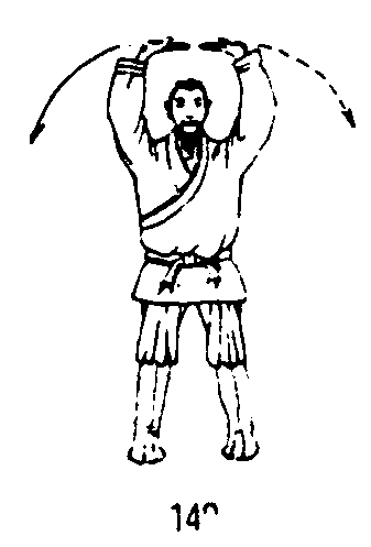 四十九式经络动功第3段“导气”动作之十四(全套动作顺序第三十六式):❶随着吸气,提肛调裆;脚跟提起,两掌心朝上从脑后托起,臂自然伸直,掌指相对;眼平视前方。(图149)❷随着呼气,松腹松肛;同时脚跟落地,两腿伸直,两掌向身体侧前方下落;眼平视前方。(图150)要点:提肛与松肛要与呼吸紧密结合;两掌上托时将气导入十指,下按时将气沉入丹田或涌泉。