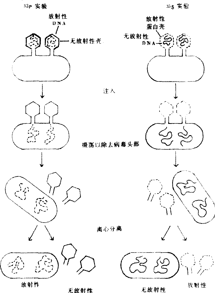 图573 赫希尔—蔡斯实验的概述 真核细胞的线粒体和叶绿体中也有极少量的DNA和自己的独特复制、转录和转译系统,可以合成本身的一部分蛋白质,其余的蛋白质由细胞质输入。病毒由核酸和蛋白质组成,其遗传物质也是核酸。有的病毒含有RNA,有的病毒含有DNA。噬菌体(细菌病毒)是遗传学研究常用的实验材料。它们有多种形态,大肠杆菌T偶数噬菌体具有头部和尾部,约含182000个碱基对,是最复杂的DNA噬菌体。1952年赫尔希(Alfred D. Hershey)和蔡斯(Martha Chase)所做证明DNA携带遗传信息的重要实验就是用T2噬菌体做的同位素标记实验。他们证明,当T2噬菌体颗粒感染宿主大肠杆菌细胞时,实际进入宿主细胞并促使病毒复制的遗传物质是T2病毒的DNA,而不是它的蛋白质。实验是这样做的。准备两种同位素标记的噬菌体颗粒,一种是用32P标记噬菌体DNA的磷酸基,而另一种是用35S标记噬菌体外壳蛋白质中的含硫氨基酸。然后将两种类型的标记噬菌体分别加到未标记的大肠杆菌的悬浮液中,并在振荡器中振荡,结果发现:被32P标记的病毒颗粒所感染的细胞含有放射性,说明标记的病毒DNA注入细胞,而用35S标记病毒颗粒所感染的细胞则不具有放射活性,但存在于振荡器中的病毒空壳却含有35S。因为在两种情况中都找到了子代病毒颗粒,可见它们复制的遗传信息是由病毒DNA,而不是由病毒蛋白质引入的。DNA的结构单元为脱氧核苷酸,含有磷酸、脱氧核糖和4种主要碱基(A、T、G、C),成千上万个脱氧核苷酸按不同顺序排列,可以构成众多的DNA分子。这种顺序,也称碱基序列,即为DNA分子的一级结构,遗传信息就贮存在序列之中。